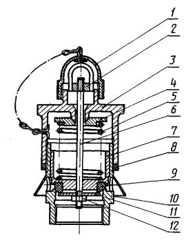 Рис. 7.13. Предохранительный клапан: 1 - колпачок; 2 - гайка; 3 - накидная гайка; 4 - центрирующая шайба; 5 - пружина; 6 - шток; 7 - седло клапана; 8 - контргайка; 9 - уплотнительное кольцо; 10 - корпус; 11 - шайба; 12 - гайка