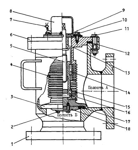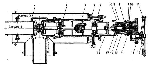Рис. 8.19. Сливоналивной вентиль цистерны модели ВЖЦ 100М: 1 - корпус; 2 - затвор; 3 - втулка; 4 - прокладка; 5 - втулка; 6 - кольцо; 7 - шарикоподшипник; 8 - кольцо; 9 - указатель; 10 - ограничитель; 11 - маховик; 12 - гайка М20×1,5; 13 - редуктор; 14 - установочная гайка; 15 - тарельчатая пружина; 16 - резьбовая втулка; 17 - ходовой винт; 18 - кожух Корпус с кожухом 1 и кожух 18 соединены друг с другом через сильфонный узел и втулку 5 шпильками. Для герметичности корпуса с кожухом и сильфонного узла установлена прокладка 4. Внутри корпуса с кожухом 1 имеется седло, при посадке на которое клапан перекрывает подачу жидкого продукта. Сильфонный узел и клапан образуют затвор 2, в гильзе которого для проверки герметичности сильфонов имеется отверстие, закрытое заглушкой с прокладкой и опломбированное. Сильфонный узел состоит из двух сильфонов, приваренных к втулке. К другим концам сильфонов приварены концевики, соединенные между собой шпинделями, проходящими по внутренней полости сильфонов. Для разобщения продуктовой полости от атмосферы и служат сильфоны. Кожух 18 состоит из фланца, трубы и стакана, соединенных сваркой. В кожух запрессована втулка с квадратным отверстием. В кожухе 18 находятся элементы, преобразующие вращательное движение в поступательное: ходовой винт 17, резьбовая втулка 16, подшипник 7, тарельчатая пружина 15, установочная гайка 14 и кольца. Ходовой винт 17 имеет только поступательное движение (от вращений его удерживает упомянутая выше втулка с квадратным отверстием). Упорный шарикоподшипник 7 насажен на резьбовую втулку 16 и позволяет ей легко вращаться даже при наибольших усилиях, возникающих во время закрытия вентиля. Кольца 6 и 8 направляют резьбовую втулку 16. Тарельчатая пружина 15 является компенсатором при температурных деформациях деталей. Установочная гайка 14 предохраняет резьбовую втулку от осевого перемещения. Текстолитовые втулки 3 и 5 служат тепловым мостом и этим исключают обмерзание кожуха 18, обеспечивают нормальную работу вентиля. Открытие и закрытие вентиля производится вращением маховика 11, связанного через редуктор 13 с резьбовой втулкой 16 и закрепленного гайкой 12. Редуктор используется для уменьшения усилия при вращении маховика. Вращением маховика против хода часовой стрелки вентиль открывается. При этом резьбовая втулка 16 вращается и вызывает поступательное движение ходового винта 17, который соединен шпильками с концевиком сильфонного узла через полумуфты и приставку. Через шпиндель сильфонного узла поступательное движение передается клапану. В то же время выдвигается указатель 9. Появление нанесенной на нем красной эмалью риски говорит о полном открытии вентиля. Регулирование хода клапана производится на заводе-изготовителе ввинчиванием или вывинчиванием ограничителя 10 по резьбовой втулке 16. При закрытии вентиля маховик вращают по ходу часовой стрелки, пока указатель 9 не установится заподлицо с торцом ограничителя 10. Коммуникации наддува и дренажа предназначены для создания в сосуде цистерны избыточного давления газообразного продукта и сброса избыточного давления паров продукта в атмосферу или в коммуникации станции наполнения (опорожнения) при необходимости. В состав этих коммуникаций (см. рис. 8.18) входят: 1) труба наддува с фильтрами Ф3, Ф4 и вентилем ВН12; 2) трубопроводы дренажа с вентилями ВН4 и ВН5. Труба наддува, ка