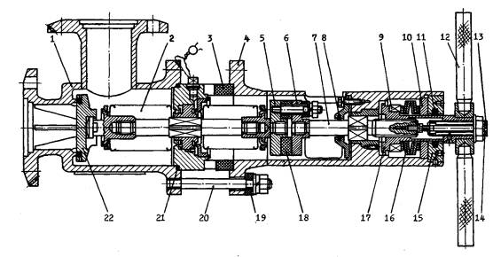 Рис. 8.4. Сливоналивной вентиль: 1 - корпус; 2 - сильфонный узел; 3 - проставка; 4 - кожух с втулкой; 5, 6 - полумуфты; 7 - ходовой винт; 8 - войлочное кольцо; 9 - подшипник типа 8107; 10 - кольцо; 11 - войлочное кольцо; 12 - вороток; 13 - указатель; 14 - ограничитель; 15 - установочная гайка; 16 - тарельчатая пружина С60×30×3×15; 17 - резьбовая втулка; 20 - шпилька AM12×100; 21 - прокладка; 22 - золотник