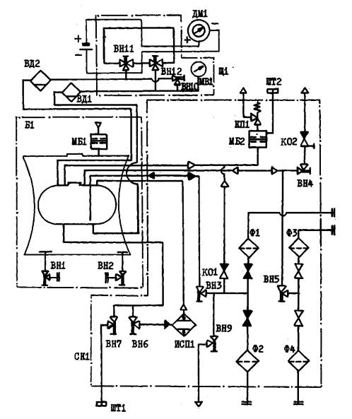 Рис. 8.7. Принципиальная пневмогидравлическая схема цистерны модели 15-558С Емкость Б1 оборудована вакуумными вентилями ВН1, ВН2 (Dу 80) для вакуумирования изолирующего пространства и мембранным предохранителем МБ1 для защиты оболочки и сосуда от недопустимого повышения давления в изолирующем пространстве. Разрушающее давление для мембраны предохранителя составляет 0,06 ... 0,085 МПа (0,6 ... 0,85 кгс/см2). Система коммуникаций предназначена для проведения технологических операций по подготовке цистерны к работе, наполнению сосуда жидким продуктом, дренажу избыточного давления паров продукта из сосуда цистерны в сторонние коммуникации отбора газа или непосредственно в атмосферу, отбору проб продукта на анализ, опорожнению сосуда и выдаче продукта в жидком или газообразном состоянии, а также для предохранения сосуда и коммуникаций от разрушения при повышении давления в них свыше допустимого. В состав системы коммуникаций цистерны входят: 1) коммуникация слива-налива; 2) коммуникация испарителя; 3) коммуникация газосброса; 4) коммуникация наддува и отбора газа; 5) коммуникация анализа; 6) предохранительное устройство сосуда. Коммуникация слива-налива предназначена для наполнения сосуда жидким продуктом и его слива. Она включает вентиль слива-налива ВН3 (Dу 50), два фильтра Ф1, Ф2, обратный клапан К01 и вентиль ВН9 (Dу 12). Сетчатые цилиндрические фильтры Ф1, Ф2 установлены в патрубках, оборудованных присоединительными муфтами для подключения внешних продуктопроводов и закрытых крышками, и служат для очистки жидкого продукта от механических загрязнений. Сливоналивные патрубки выведены наружу по обе стороны арматурного шкафа и закрыты дополнительными защитными кожухами. Обратный клапан KO1 (Dу 15) (рис. 8.8) предназначен для предохранения трубопровода слива-налива от разрушения избыточным давлением паров за счет испарения остатков жидкого продукта, сохранившихся в трубопроводе после окончания наполнения сосуда и закрытия вентиля ВН3. Клапан отрегулирован на давление срабатывания 0,1 МПа (1 кгс/см2). Вентиль ВН9 (Dу 12) служит для сброса давления из коммуникации слива-налива при закрытом вентиле ВН3. Коммуникация испарителя, включающая вентиль ВН6 (Dу 25), испаритель ИСП1 и жидкостные и газовые трубопроводы, соединяющие их с сосудом, предназначена для газификации жидкого продукта и создания в сосуде избыточного давления для слива жидкого продукта или выдачи его в газообразном состоянии. Испаритель ИСП1, состоящий из ребристых алюминиевых труб, объединенных на концах коллекторами, установлен под рамой платформы цистерны и крепится к ней шпильками через деревянные колодки. Жидкий продукт, поступающий в испаритель из нижней зоны сосуда цистерны при открытии вентиля ВН6, испаряется (газифицируется) за счет нагревания в неизолированных от внешней среды трубопроводах испарителя теплопритоком от окружающей среды. Коммуникация газосброса, включающая вентиль ВН4 (Dу 50), обратный клапан К02 и соединительные трубопроводы, предназначена для сброса избыточного давления паров продукта из сосуда в атмосферу при транспортировании или хранении жидкого продукта. Обратный клапан КО2 Dу 50, рис. 8.9) служит для поддержания избыточного давления в сосуде цистерны при нормальных условиях транспортирования продукта с открытым вентилем ВН4. Благодаря избыточному давлению в 