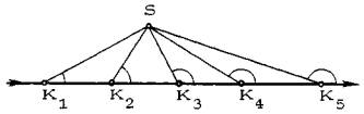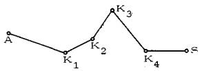 Рис. 4. Маршрут из А в S нежизнеспособен, поскольку на участках K2K3 и K3K4 величина контрольного угла выходит за пределы 30° При этом сразу, скачком меняется величина контрольного угла. Таким образом, достаточно выяснить, нарушается ли условие комфортности по отношению к точке S при входе в точку K1. Если нет, то оно выполнено заведомо на всем участке AK1. Точно так же при движении по участку AK1 величина контрольного угла непрерывно возрастает по отношению к точкам K2, K3, K4, и достаточно выяснить, нарушается ли условие комфортности по отношению к этим точкам при входе в точку K1. Аналогичным образом проверяется выполнение условия комфортности при входе в вершины K2, K3 и K4. Следовательно, число проверяемых точек равно числу вершин ломаной, по которой проходит маршрут. Ниже будет рассмотрен более простой и удобный способ проверки сети на комфортность. 1.3. ПОСТАНОВКА ЗАДАЧИ1.3.1. Условие жизнеспособности рассматривается как основное условие, которому должна удовлетворять проектируемая пешеходная сеть. Частным случаем жизнеспособных пешеходных сетей являются естественно-жизнеспособные сети, которые строятся при отсутствии препятствий. Для зафиксированной системы исходных и целевых точек может быть построено, вообще говоря, бесконечное множество естественно-жизнеспособных сетей. Таким образом, имеется возможность выбора, т.е. возможность оптимизации. Поскольку комфортные характеристики сети достаточно учитываются условием естественной жизнеспособности, оптимизация ведется по критерию минимума строительных и эксплуатационных затрат. Решение этой задачи "в лоб" связано с серьезными трудностями, поэтому вместо оптимизации комфортной сети по критерию суммарных затрат осуществляется оптимизация ее по критерию суммарной длины ее ребер. При этом отклонение от оптимума по первому критерию незначительно (доли процента). Поэтому математическая задача, являющаяся предметом непосредственного рассмотрения, формулируется следующим образом: для заданного множества целевых точек и исходных точек их ареалов построить связующую их естественно-жизнеспособную сеть, оптимальную по критерию минимума суммарной длины всех ее ребер. 1.3.2. Вопросы конфигурации пешеходной сети рассматриваются независимо от расчета потоков по ней. Возможность такого подхода вытекает из того, что, во-первых, условие естественной жизнеспособности, существенно влияющее на конфигурацию сети, никак не связано с величинами потоков, поскольку критическое значение контрольного угла является константой, и во-вторых, оптимизация ведется по критерию длины сети, а не по критерию суммарных затрат и, следовательно, не связана ни с величинами сечений участков сети, ни с определяющими их потоками. Но даже с учетом этого задача конструирования оптимальной естественно-жизнеспособной сети остается весьма сложной. Чтобы справиться со сложностью задачи, ее рассмотрение строится индуктивно: вначале вводится целый ряд упрощающих предположений и, по мере решения упрощенных версий задачи, постепенно снимаются введенные упрощения и, в конечном итоге, осуществляется переход к уровню сложности, адекватному сложности реальной проектной задачи. Основные упрощения на первом шаге состоят в исключении из рассмотрения системы препятствий и заданной (существующей) сети пешеходных путей, а 