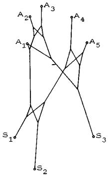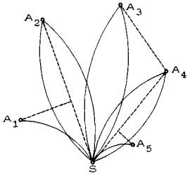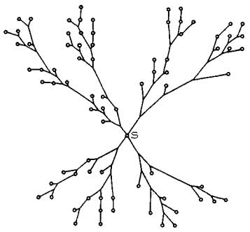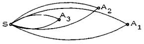 Рис. 20. Частный случай формирования собирающих секторов: точка А2 кооперируется с точкой А1, поскольку лежит к ней ближе, чем к А3 Справедливость его может быть строго доказана. Как следствие, получаем правило: чем ближе друг к другу точки (имеется в виду величина центрального угла между их рабочими осями), тем больше оснований для их включения в один собирающий сектор. Из тех же соображений следует минимизировать суммарную величину всех собирающих секторов или, что то же самое, максимизировать суммарную величину разделительных секторов. Итак, следует включать в один собирающий сектор точки, которые расположены плотнее друг к другу; выбрасывать из собирающих секторов те элементарные секторы, которые больше других по величине; стремиться свести к минимуму, с одной стороны, число собирающих секторов, с другой - величину каждого из них. На рис. 21 приведен пример сети с одной целевой точкой. Сеть имеет структуру дерева с дихотомическим ветвлением в чистых узлах. Из целевой точки S выходят четыре конечных ребра (в общем случае их может быть и более семи), соответствующих четырем собирающим секторам. Построения в собирающих секторах ведутся независимо друг от друга в произвольном порядке.