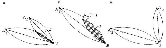 Рис. 6. Использование рабочих полей как инструмента проверки пешеходной сети по условию естественной жизнеспособности: маршруту м(S, А1), м(S, А3), м(S, А5) нежизнеспособны Пусть, например, запроектирована некоторая пешеходная сеть, связывающая исходные точки А1, А2, ... , А5 с целевой точкой S (рис. 6). Анализ сети на комфортность сводится к выделению всех маршрутов на сети и исследованию каждого из них на комфортность. В нашем примере таких маршрутов, очевидно, ровно столько, сколько исходных точек (маршруты рассматриваем как из целевой точки в исходные, так и в обратном направлении, т.е. как двухсторонне ориентированные). Все пять маршрутов представляют собой выпуклые ломаные (отрезок - частный случай выпуклой ломаной). Маршруты м(S, А1), м(S, А3), м(S, А5) дискомфортны, поскольку выходят за пределы своих рабочих полей. Следовательно, заданная сеть нежизнеспособна. 2. ПОСТРОЕНИЕ ПЕШЕХОДНЫХ СЕТЕЙ В УПРОЩЕННЫХ ЧАСТНЫХ СЛУЧАЯХ2.1. ЕСТЕСТВЕННО-ЖИЗНЕСПОСОБНАЯ СЕТЬ С ОДНОЙ ЦЕЛЕВОЙ ТОЧКОЙПростейший случай (Центральная теорема) 2.1.1. Свойства рабочих полей используются для построения оптимальной естественно-жизнеспособной сети в простейшем случае, когда заданы две исходные точки и одна целевая. (Случай одной исходной точки и одной целевой тривиален: сеть представляет собой отрезок прямой, соединяющей исходную точку с целевой, т.е. совпадает с рабочей осью.) Пусть заданы две исходные точки А1, и А2 и целевая точка S (рис. 7). Если точки А1 и А2 расположены относительно S таким образом, что ÐА1SА2 < 60°, то их рабочие поля пересекаются, образуя рабочую лунку z. Диаметр рабочей лунки (наибольшая из ее хорд) соединяют точку S с точкой T, которая является вершиной лунки, лежащей в точке пересечения рабочих дуг в случае, если ни одна из исходных точек не лежит внутри рабочего поля другой (рис. 7а), или, в противном случае, в той исходной точке, которая лежит внутри рабочего поля другой (рис. 7б). Если же ÐА1SА2 > 60°, то рабочие поля не пересекаются и не имеют ни одной общей точки, кроме точки S (рис. 7в),