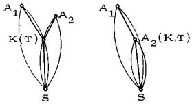 Рис. 8. На участке KS, лежащем в рабочей лунке, маршруты, связывающие точки А1 и А2 с точкой S, жизнеспособны и кооперируются. Где следует разместить узел K, чтобы длина связующей сети была минимальной 2.1.2. Вопрос о том, где именно в пределах общей лунки рабочих полей следует разместить узел K с точки зрения минимизации длины сети, решается следующей теоремой. Центральная теорема Пусть рабочие поля R(S, A1) и R(S, A2) пересекаются, образуя рабочую лунку z. Минимум длины естественно-жизнеспособной сети, связывающей исходные точки А1, А2 с целевой точкой S, достигается при размещении узла K в вершине T лунки z (рис. 9).