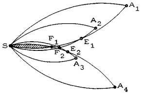 Рис. 11. Вырожденный случай: собирающий сектор с одной крайней точкой (точка А3) Как правило, опорная лунка совпадает с рабочей лункой крайних точек. Однако это не обязательно. На рис. 12 штриховкой выделена опорная лунка SF1, принадлежащая всем рабочим полям собирающего сектора A1SA4. Рабочие поля R(S, A1) и R(S, A4), пересечением которых образована эта лунка, не пусты. Пусты рабочие поля R(S, A2) и R(S, A3), и, следовательно, точки А2 и А4 - крайние, но их рабочая лунка SF2 не является опорной, поскольку не принадлежит рабочим полям R(S, a1) и R(S, A4). Для того чтобы возникла подобная ситуация, необходимо, чтобы хотя бы одна из рабочих дуг, ограничивающих опорную лунку, пересекалась с одноименной рабочей дугой, ограничивающей пустое рабочее поле. В примере на рис. 12 таких точек пересечения две E1 и E2. Такие точки называются точками перелома.