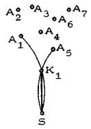 Рис. 12. Опорные дуги: А2Е1F1S и А3Е2F1S Рассмотрим дугу, состоящую из двух участков, первый из которых принадлежит рабочей дуге крайней точки и соединяет крайнюю точку с соответствующей точкой перелома, а второй принадлежит рабочей дуге, ограничивающей опорную лунку, и соединяет точку перелома с целевой точкой. Эта дуга называется опорной. На рис. 12 опорными являются дуги А2Е1F1S и А3Е2F1S. В случае совпадения опорной лунки с рабочей лункой крайних точек опорные дуги совпадают с рабочими дугами крайних точек (см. рис. 10). Такая ситуация встречается наиболее часто. Теорема о конечном нижнем ребре 2.1.5. Если в построенной или строящейся сети маршрут из исходной точки А в целевую точку S проходит через некоторое ребро d, то будем говорить, что точка А опирается на ребро d. Поскольку по определению опорное ребро принадлежит рабочим полям всех исходных точек собирающего сектора, оно может принадлежать всем маршрутам между целевой точкой и исходными точками собирающего сектора одновременно, т.е. может быть принято в качестве ребра конструируемой естественно-жизнеспособной сети, на которое опираются все исходные точки. Ребро сети, непосредственно выходящее из целевой точки, называется конечным нижним ребром. Теорема о конечном нижнем ребре Оптимальная естественно-жизнеспособная пешеходная сеть, связывающая целевую точку со всеми исходными точками собирающего сектора, всегда имеет одно конечное нижнее ребро, совпадающее с опорным ребром собирающего сектора. Доказательство этой теоремы (мы его не приводим) опирается на Центральную теорему. Рис. 13, на котором опущены все рабочие дуги, кроме опорных, иллюстрирует теорему о конечном нижнем ребре. Поскольку SK1 - опорное ребро, то, исходя из теоремы, оно должно быть принято в качестве конечного нижнего ребра оптимальной естественно-жизнеспособной сети, связывающей исходные точки А1, А2, ... , А7 с целевой точкой S. Построение опорного ребра является первый шагом построения сети в собирающем секторе.