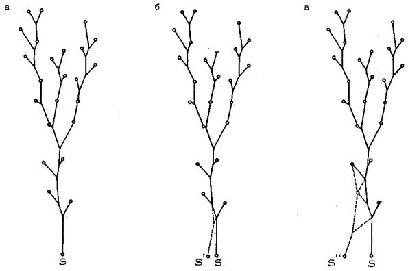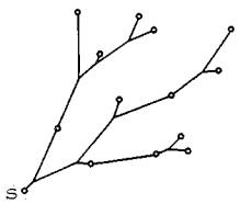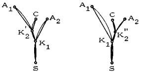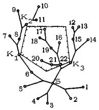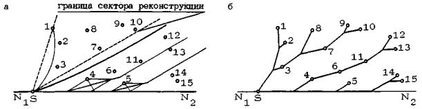 Рис. 13. Конечное нижнее ребро строящейся сети совпадает с опорным ребром SK1 собирающего сектора Структура сети в собирающем секторе 2.1.6. Приступая к построению пешеходной сети, необходимо ясно представить себе ее структуру. Для этого понадобится три определения теории графовх) Пусть задан граф G. Цепью называется такая конечная последовательность вершин графа, при которой каждая вершина соединена ребром с соседней. Если первая и последняя вершины цепи совпадают, то такая цепь называется циклом. Деревом называется связный граф, не содержащий циклов. х) Графом называется геометрическая фигура, состоящая из точек (вершин) и линий (ребер), соединяющих определенные пары этих вершин и представляющих связи между ними. См., например, Н. Кристофидес. Теория графов (алгоритмический подход). М., Мир, 1978. Теорема В оптимальной естественно-жизнеспособной сети, связывающей исходные точки собирающего сектора с целевой, в каждом узле сходится не более чем три ребра, и граф сети представляет собой дерево. Слова "не более", встречающиеся в теореме, означают следующее. При движении от целевой точки вверх по сети (т.е. по направлению к исходным) мы обнаружим, что в каждом чистом узле сети (т.е. в узле, не совмещающемся ни с какой из заданных исходных точек) входящему участку, по которому мы пришли к узлу, соответствует два выходящих участка, по которым мы можем продолжать движение вверх. В смешанном узле (т.е. в узле, совпадающем с одной из заданных точек) входящему участку соответствует, как правило, один выходящий участок (рис. 14). Отсюда следует, что из узла К1, являющегося чистым узлом (см. рис. 13), должно выходить два ребра (две ветви), на каждое из которых опирается некоторое подмножество множества исходных точек. Следовательно, ближайшая задача после построения конечного нижнего ребра сети - разбиение множества исходных точек на эти два подмножества. Если же узел K1 смешанный, то он рассматривается в качестве промежуточной целевой точки, и из него строится новое опорное, ребро.