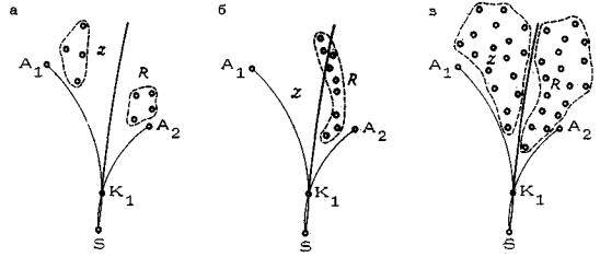 Рис. 17. Использование кривой равного тяготения для разбиения множества исходных точек на подмножества левой (z) и правой (R) ветвей (различные случаи) Не представляет затруднений и ситуация с большим числом исходных точек, достаточно равномерно распределенных в собирающем секторе (рис. 17в). Все точки, лежащие в зоне z, можно отнести к левой ветви, а точки в зоне R - к правой ветви. Если при этом не обязательно достигается глобальный оптимум сети, то заведомо достигается хорошее приближение, вполне достаточное с практической точки зрения. Разумеется, не во всех случаях задача разбиения множества исходных точек на два подмножества решается легко. В зависимости от конкретной конфигурации разбиваемого множества точек проектировщик может испытывать более или менее серьезные колебания в выборе того или иного разбиения. Однако, число возникающих альтернатив, как правило, не превышает двух-трех, и они могут быть сопоставлены непосредственно. Построения в собирающем секторе 2.1.10. Рассмотрим ситуацию, которая возникает в тот момент, когда множество точек собирающего сектора разбито на два подмножества, относимые к левой и правой ветвям строящейся сети (см. рис. 17а). Выбираем сначала одно подмножество (например, левое). Добавим к нему левую крайнюю точку, получаем множество точек, опирающихся на еще не построенное левое ребро, выходящее из узла K1. Узел K1 следует теперь рассматривать как промежуточную целевую точку, а точки левой ветви как точки нового собирающего сектора (второго ранга), и следующий шаг построения сети сводится к двум основным рассмотренным выше операциям: 1) отысканию крайних точек и построению опорного ребра, связывающего узел K1, построенный на предыдущем шаге (промежуточную целевую точку), с новым узлом K2, который лежит на пересечении опорных дуг; 2) разбиению рассматриваемого множества точек (в данном случае левого подмножества первоначального множества точек) на два подмножества, одно из которых относится к левой ветви (второго ранга), выходящей из узла K2, а другое - к правой ветви (второго ранга). Далее все повторяется снова по отношению к новому выбранному подмножеству. Порядок выбора очередного подмножества на каждом шаге, вообще говоря, безразличен и определяется соображениями удобства. При отыскании крайних точек и построении опорного ребра на очередном шаге для обеспечения комфортности сети необходимо осуществлять дополнительный контроль по отношению к целевой точке и всем ранее построенным узлам, ведущим в целевую точку. Заметим, что на каждом шаге, кроме самого первого, в действительности отыскивается только одна крайняя точка, поскольку в качестве второй всегда принимается одна из крайних точек предыдущего шага. Поскольку число точек собирающего сектора конечно, то последовательность разбиений первоначального множества неизбежно приводит к тому, что на некотором шаге очередное выбранное множество будет содержать всего одну точку, которая непосредственно соединяется ребром с последним узлом. При дальнейших разбиениях каждая исходная точка рано или поздно оказывается единственным элементом рассматриваемого множества, и остается лишь построить ребро, связывающее ее с узлом, по отношению к которому рассматривается данное множество. Таким образом, происходит постепенное продвижение от нижних ребе