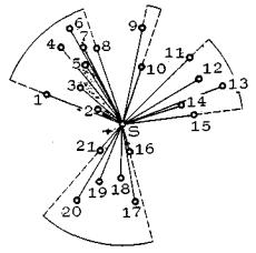 Рис. 19. Разбиение множества исходных точек на подмножества, образующие собирающие секторы; вспомогательный прием - проведение отрезков, соединяющих исходные точки с целевой точкой S (рабочих осей); границы собирающих секторов показаны пунктиром На рис. 19 элементарными являются секторы Т(1, 2), Т(2, 3), Т(3, 4), ... , Т(21, 1), основными разделительными - секторы Т(21, 1) и Т(15, 16), распределительными - секторы Т(1, 15) и Т(16, 21). Очевидно, что проблема заключается в оптимальном вычислении из распределительных секторов собирающих секторов. Секторы, отделяющие один собирающий сектор от другого, назовем распределительными. На рис. 19 секторы Т(21, 1), Т(8, 9), T(10, 11), Т(15, 16) являются разделительными по отношению к собирающим секторам Т(1, 8), Т(9, 10), Т(11, 15), Т(16, 21). Если распределительный сектор по величине меньше 60°, то он, очевидно, сразу принимается в качестве собирающего. Таков, например, сектор Т(16, 21). 2.1.14. Во многих случаях способ выделения собирающих секторов в распределительном интуитивно очевиден, как это имеет место на рис. 19, но так бывает не всегда. Приведем некоторые полезные соображения, которые следует учитывать в более сложных случаях. Пусть даны три исходные точки А1, А2, А3, лежащие на одинаковом расстоянии от целевой точки, причем точки А1 и А2 ближе друг к другу, чем точки А2 и А3 (рис. 20) и ÐA1SA2, ÐA2SA3 < 60° a ÐA1SA3 > 60°. Таким образом, все три точки не могут попасть в один собирающий сектор, и возникает дилемма: с какой из точек кооперировать точку А2. Ответ интуитивно очевиден: надо скооперировать А2 с А1.