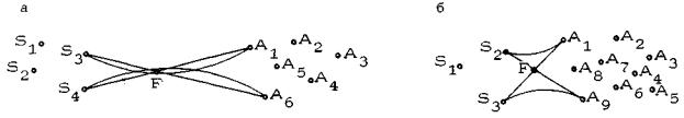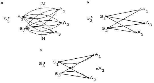 Рис. 23. К определению полигонов типа А и В: а - в полигонах типа А и В существует прямая MN, разделяющая множество исходных {А1, А2, А3} и целевых {S1, S2, S3}точек (на рисунке показаны пустые рабочие поля); б - рабочие оси пустых рабочих полей; S1A1 и S2А3 - главные оси полигона (не пересекаются с другими осями); в – S1, S2, А1, А2 - крайние точки полигона, F - фокус, D┘(S1, А1) и D└(S2, A2) - главные дуги полигона Построим все рабочие поля (от каждой из целевых точек ко всем исходным) и выберем среди них множество пустых рабочих полей, т.е. полей, которые не содержат других заданных точек. В нашем примере это R(S1, A1), R(S1, A2), R(S1, A3), R(S2, A1), R(S2, A2), R(s2, A3). Среди рабочих осей этих полей найдутся не более чем две такие, которые не пересекаются с другими рабочими осями. Они называются главными осями полигона, а соответствующие рабочие поля - главными полями. В нашем случае главные оси - S1A1 и S2A2, (рис. 23б). Точки, лежащие на концах главных осей полигона, называются крайними точками полигона. В общем случае число крайних точек, очевидно, равно четырем. Однако возможны вырожденные случаи, когда крайних точек три или даже две (если главная ось полигона одна). Рассмотрим четырехугольник, вершинами которого являются крайние точки, а двумя сторонами - главные оси. Точку пересечения его диагоналей назовем фокусом и обозначим F (рис. 23в). Рабочие дуги, соответствующие главным осям полигона и обращенные выпуклостью друг к другу, назовем главными дугами полигона. В нашем случае D┘(S1, A1) и D└(S2, A2) - главные дуги. 2.2.5. Существенно важен вопрос, пересекаются ли главные дуги полигона. Если главные дуги пересекаются или касаются, то такой полигон называется полигоном типа А. Если же главные дуги полигона не имеют ни одной общей точки, то такой полигой называется полигоном типа В. Общим для полигонов типов А и В являются два условия: 1) граф существенных связей представляет собой полный двудольный граф; 2) существует прямая MN , разделяющая подмножества вершин двудольного графа. На рис. 24а приведен пример полигона типа А, а на рис. 24б пример полигона типа В. Показаны главные дуги, диагонали и фокусы полигонов.