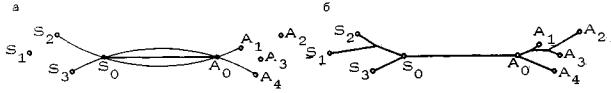 Рис. 25. Построение сети в полигоне типа А: а - первая фаза построения: показаны главные дуги полигона и диаметр S0А0 опорной лунки; задача сводится к построениям в двух собирающих секторах (первый - с вершиной S0 и множеством вершин А, второй - с вершиной A0 и множеством вершин S); б - построенная сеть Заметим, что ситуация, в известном смысле, симметрична относительно двух