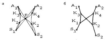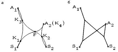 Рис. 26. Построение сети в элементарном полигоне типа В: а - использование фокуса для построения узлов K1, K2, K3, K4; б - построенная сеть (ребра K1K4 и K2K3 образуют простую связку) Построения в элементарном полигоне типа В ведутся следующим образом. Строим рабочие дуги, связывающие фокус полигона F с крайними точками D└(F, А1), D┘(F, А2), D└(F, S2), D┘(F, S1) и фиксируем точки их пересечения K1, K2, K3, K4 с главными дугами. Рассматривая найденные точки как узлы сети, строим саму сеть (рис. 26б). 2.2.8. Обратим внимание на характерную пару скрещивающихся ребер K1K4, и K2K3. Одно из ребер используется на маршрутах м(S2, A1) и м(A1, S2), а второе на маршрутах м(S1, A2) и м(A2, S1), т.е. оба они используются на диагональных маршрутах. Эти ребра позволяют перейти с одной главной дуги полигона на другую, связывают эти дуги. Такая пара ребер называется простой связкой рабочих дуг D┘(S1, A1) и D└(S2, A2). Простая связка всегда располагается в окрестности наибольшего сближения главных дуг, так что точка пересечения ребер простой связки расположена вблизи прямой, соединяющей центры главных дуг. Как правило, она близка также к фокусу полигона. Простую связку, все четыре узла которой являются чистыми узлами, называют невырожденной, а связку, в которой хотя бы один узел является смешанным, - вырожденной. Пример элементарного B - полигона с вырожденной связкой приведен на рис. 27. Поскольку рабочая дуга D└(S2, A2) не пересекается с главной дугой D└(S2, A2), то узел K4 совпадает с исходной точкой A2.