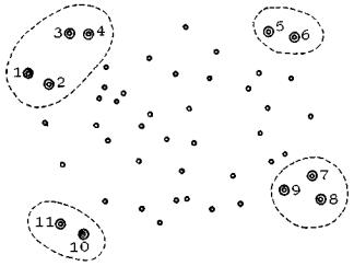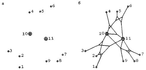 Рис. 29. Пример построения сети с двумя целевыми точками: а - заданное размещение точек; точки 10 и 11 - целевые; задача сводится к построениям в трех полигонах типа B: во всех трех случаях одно подмножество образуют целевые точки 10 и 11, а второе - точки (1, 2, 3), (4, 5, 6), (7, 8, 9) соответственно; б - построенная сеть 2.2.12. В некоторых случаях удобно разбить множество целевых точек на группы, для каждой из которых построить свою интегральную сеть (такую сеть будем называть групповой), осуществить суперпозицию групповых сетей, а затем интегрирование полученной сети. Пусть, например, заданные точки расположены так, как это показано на рис. 30 (целевые точки обозначены двойным кружком и пронумерованы). Предположим, что в ареал влияния каждой целевой точки входят все заданные исходные точки. В данном случае удобно разбить множество целевых точек на группы (1, 2, 3, 4), (5, 6), (7, 8, 9) и (10, 11). Каждая из выделенных групп образует вместе со множеством исходных точек полигон типа B. После построения групповых сетей удобно произвести их попарное кооперирование: сети (1, 2, 3, 4) с сетью (7, 8, 9), а сети (5, 6) с сетью (10, 11), и лишь после этого переходить непосредственно к синтезу интегральной сети из построенных двух групповых сетей (1, 2, 3, 4, 5, 7, 8, 9) и (5, 6, 10, 11).
