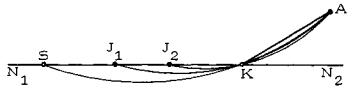 Рис. 31. Простейший пример: N1N2 - существующая прямолинейная трасса; S - целевая точка на трассе; А - исходная точка, присоединяемая к трассе отрезком AK, наклоненным по отношению к ней под углом 30°; точка K строится с использованием рабочей дуги D└(S, А) Для того чтобы рабочая дуга D(S, A) пересекалась с трассой, необходимо, чтобы рабочая ось SA была наклонена к трассе под углом, меньшим 30°. 2.3.3. Проведем через точку S прямые Р1Р4 и Р2Р3, наклоненные под углом 30° к трассе (рис. 32). Секторы P1SN1, P2SN2, P3SN1, P4SN2 называются секторами реконструкции на прямой, а лучи SP1, SP2, SP3 и SP4 - границами этих секторов. Будем говорить, что точка А может быть привязана, если существует естественно-жизнеспособный маршрут, связывающий точку А с точкой S, такой, что хотя бы часть его проходит по трассе. Для этого необходимо, чтобы некоторый отрезок трассы принадлежал рабочему полю r(S, A). Ясно, что это условие выполнено для точек, принадлежащих секторам реконструкции (кроме их границ) и не выполнено для всех остальных точек. Следовательно, любая точка, лежащая строго внутри поля реконструкции, может быть привязана к трассе.