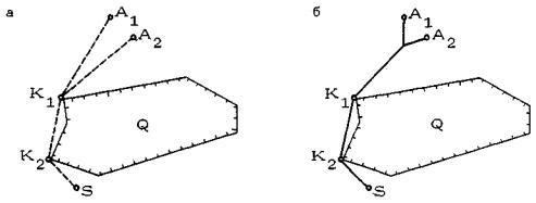 Рис. 35. Задачи, связанные с обходом препятствий: выбор направления обхода и построение кратчайшего жизнеспособного маршрута из точки А в точку S; точки K1, K2, K3, K4 - подставные 2.3.10. При одной исходной и одной целевой точках кратчайшая жизнеспособная сеть совпадает по трассировке с кратчайшим жизнеспособным маршрутом между этими точками точно так же, как при построении естественно-жизнеспособной сети. В этом случае - задача построения сети сводится к построению маршрута. При наличии нескольких исходных точек задача построения кратчайшей жизнеспособной сети становится самостоятельной. Ее решение начинается с построения кратчайших маршрутов от исходных точек к целевой. Пусть, например, заданы две исходные точки А1, А2, закрытые по отношению к целевой точке S препятствием Q (рис. 36а). Построим кратчайшие жизнеспособные маршруты м(А1, S) и м(A2, S), обозначив подставные точки K1 и K2. Рассматривая точку K1 как промежуточную целевую, мы можем скооперировать участки А1K1, и А2K1, поскольку точки А1 и А2 лежат в пределах собирающего сектора относительно точки K1. В результате получаем естественно-жизнеспособный относительно подставной точки K1 фрагмент сети в собирающем секторе. Остается достроить сеть, включив в нее участки K1K2 и K2S (рис. 36б),