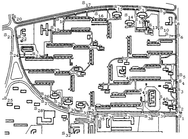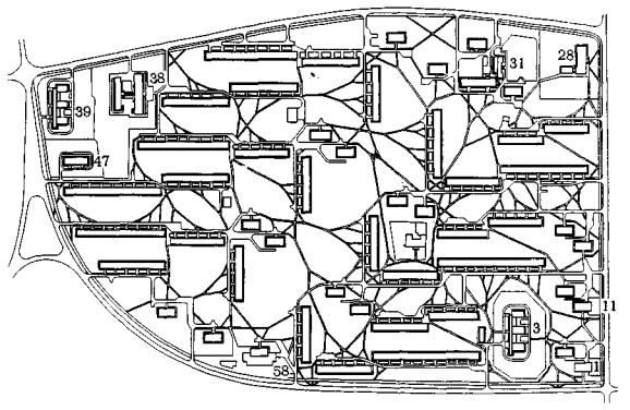 1 - комбинат бытового обслуживания; 3 - детский сад-ясли на 280 мест; 11 - столовая на 200 посадочных мест: 28 - школа на 880 учащихся; 31 - детский сад-ясли на 100 мест; 38 - школа на 960 учащихся; 39 - детский сад-ясли на 280 мест; 47 - детский сад-ясли на 140 мест; 58 - продовольственный магазин на 21 рабочее место Рис. 42. Квартал № 10. Проект пешеходной сети (вариант 2). По сравнению с вариантом 1 плотность сети в варианте 2 существенно уменьшена за счет сокращения числа целевых точек 3.2.3. Другим средством, которое может быть использовано для уменьшения плотности сети, является, как было уже отмечено, введение системы искусственных препятствий. Используемое разумно и тактично, оно лишь незначительно снижает комфорт сети, в то же время заметно отражаясь на ее плотности. Можно, например, пойти по пути разуплотнения сети в верхних ее отделах, т.е. в окрестности исходных точек. В самом деле, рассматривая сеть квартала № 10 в вариантах 1 и 2, легко заметить, что места ее наибольшей локальной плотности, как правило, находятся вблизи группы подъездов каждого из многосекционных домов. Если в качестве исходных точек при построении независимых сетей рассматривать не каждый подъезд такого дома, то тем самым будет достигнуто локальное снижение плотности. Но тогда, во избежание протаптывания стихийных дорожек от подъездов, которые не вошли в число исходных точек, необходимо создать систему локальных искусственных препятствий (например, бетонных стенок, традиционных трубчатых оград и посадок кустарников), направляющих пешеходов из этих подъездов на дорожки к соседним подъездам. Таблица Технико-экономическое сравнение вариантов пешеходной сети квартала № 10 р-на Химки-Ховрино