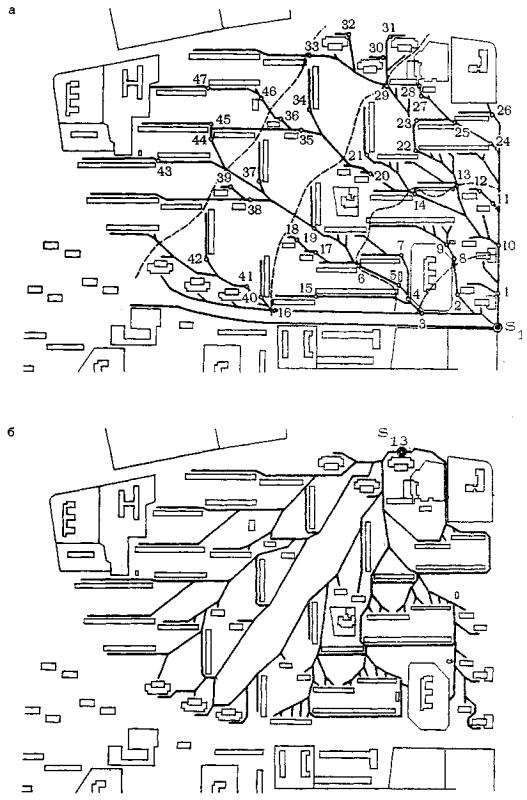 Целевые точки: S1 - транзитная к станции метро "Водный стадион", объекту приложения труда, водноспортивному стадиону "Динамо" и др.; S2,S3 - комбинат бытового обслуживания, столовая: S6, S9 - транзитные к объектам приложения труда, Головинским прудам и др.; S18, S24 - транзитные к районному центру, рынку и др.; S25 - транзитная к парку "Дружба", к станции метро "Речной вокзал", Химкинскому речному вокзалу, кинотеатру "Нева", универмагу "Ленинград" и др.; S26 - торговый центр квартала № 4; S37, S38 - объекты приложения труда. Остальные целевые точки - входы на участки школ и 38 детских учреждений, внутриквартальные объекты системы обслуживания, остановки автобусов Рис. 38. Квартал №10 района Химки-Ховрино. Проектная ситуация На плане квартала показана система автомобильных проездов и пешеходных тротуаров вдоль улиц, которая может быть использована (по крайней мере частично) для пешеходного движения. Она учитывается в рамках решения задачи реконструкции при построении естественно-жизнеспособных фрагментов конструируемой пешеходной сети. К препятствиям относятся габариты зданий и ограды участков школ и детских садов. В число целевых точек входят точки S7, S10, S11, S12, S19, S22, S23, S40, S41, S42, выколотые в препятствиях - оградах участков школ и детских садов. Конструирование сети 3.1.4. Процедуру построения пешеходной сети можно расчленить на два этапа: построение независимых сетей целевых точек и последовательное интегрирование независимых сетей (построение интегральной сети). Порядок перебора целевых точек для построения независимых сетей совершенно произволен и определяется лишь соображениями удобства. 3.1.5. При практическом построении независимых сетей бывает удобно несколько модифицировать формальные процедуры, описанные в разделе 2. Так, например, построение кратчайших маршрутов с обходом препятствий в рассматриваемую целевую точку из исходных точек ее ареала (раздел 2.3) можно вести в неявной форме, фиксируя на плане только подставные точки. Не обязательно сначала определять все подставные точки и лишь затем переходить к построению естественно-жизнеспособных фрагментов: при наличии сложной системы препятствий проще определить сначала только группу подставных точек вблизи целевой точки и построить соответствующие естественно-жизнеспособные фрагменты, затем определить новую группу подставных точек, более удаленную от основной целевой точки, и построить соответствующие фрагменты и т.д. Таким образом, вместо поочередного построения отдельных ветвей лучше вести построение единым расширяющимся фронтом, подключая к сети на каждом шаге группы точек единого порядка удаленности от целевой. На рис. 39а представлена независимая сеть целевой точки S1. Пунктирными линиями отделяются группы точек, присоединяемых к сети на каждом этапе ее конструирования. На рисунке специально выделены и пронумерованы в порядке их определения подставные точки. Значительная часть участков сети совпадает с автомобильными проездами, идущими вдоль домов. На рис. 39б показана независимая сеть целевой точки S13 (элементы процесса построения сети рассмотрены в разделе 2).