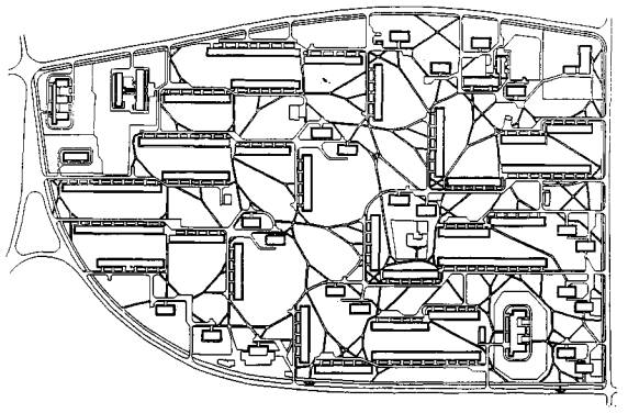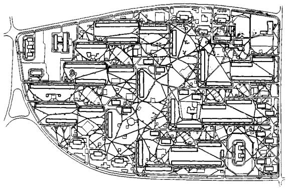 Подобный подход к разуплотнению сети с помощью системы искусственных препятствий реализован при построении варианта 3 квартала № 10 Химки-Ховрино (рис. 43), где в качестве исходного принят вариант 2. Сама система препятствий на чертеже не показана по чисто техническим соображениям, но места локальных препятствий читатель без труда определит напротив тех подъездов, к которым, в отличие от варианта 2, здесь нет собственной дорожки. Заметим, что комфорт сети в данном варианте лишь незначительно уменьшается по сравнению с комфортом сети в варианте 2. В самом деле, жители некоторой части подъездов будут испытывать дополнительный дискомфорт лишь на участке своего пути к ближайшей дорожке, идущей к соседнему подъезду. В то же время, дальнейшая часть любого маршрута не уступает в смысле комфорта варианту 2. Переход от варианта 2 к варианту 3 отнюдь не требует построения заново всех независимых путей и проведения всех этапов интегрирования. Можно просто внести локальные изменения в интегральную сеть варианта 2, что и было в данном случае сделано.