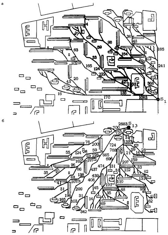 Рис. 41. Квартал № 10. Расчет потоков на экстрагированных сетях целевых точек S1 и S13: а - потоки на экстрагированной сети целевой точки S1; б - потоки на экстрагированной сети целевой точки S13 После того как рассчитаны потоки на участках всех экстрагированных сетей, производится расчет потоков на участках интегральной сети и устанавливаются сечения участков. Полученное решение должно быть дополнительно проанализировано и оценено проектировщиком. Может оказаться, что, например, через двор какого-либо жилого дома направляется чрезмерно большой поток пешеходов, что нежелательно, поскольку нарушается нормальное функционирование придомового пространства. Не исключено, что этого можно избежать, приняв другую конфигурацию пешеходной сети в рамках ее жизнеспособности. Возможно, что плотность сети в целом или на локальных участках покажется проектировщику избыточной либо из экономических, либо из функциональных соображений (например, из соображений, связанных с озеленением территории). В подобных случаях, исходя из возможностей, которыми располагает проектировщик на данной стадии, следует принять те или иные меры для регулирования параметров и общей конфигурации сети. Эти вопросы обсуждаются в разделе 3.2. Технические и организационные вопросы Технических препятствий для работы с помощью линейки и циркуля в любом стандартном масштабе - от 1:10000 до ??? - нет. Тем не менее в большинстве случаев можно рекомендовать работу в масштабе 1:5000 для объектов с территорией от 0,2 до 4,0 км2 (от 20 до 400 га) и в масштабе 1:2000 для объектов с территорией от 0,05 до 0,2 км2 (от 5 до 20 га). Чертежи более крупных масштабов желательно иметь только при расчете потоков и сечений участков сети, поскольку рядом с каждым участком необходимо указывать соответствующие величины. При построении сети удобно использовать подоснову, на которой каким-либо ярким цветом выделены все препятствия и нанесена существующая сеть пешеходных путей (включая и проезды, используемые пешеходами), а также все исходные и целевые точки. Сами построения удобно вести на кальке, накладываемой на подоснову. На отдельных листах кальки строятся независимые сети и фиксируются этапы построения интегральной сети. В организационном отношении важен вопрос о трудоемкости работ по конструированию пешеходных путей. Опыт показывает, что при наличии у проектировщика практических навыков пешеходная сеть крупного микрорайона может быть запроектирована за время порядка 50 рабочих часов, из которых около половины занимает определение конфигурации интегральной сети и примерно столько же - расчет потоков на сети. Немаловажным обстоятельством является возможность разделения труда при конструировании пешеходной сети. Например, построение независимых сетей, групповое интегрирование и расчет потоков на экстрагированных сетях могут вестись двумя или тремя исполнителями, работающими каждый независимо от других со своей группой целевых точек. В результате вместо шести рабочих дней все работы могут быть закончены в течение трех дней. 3.2. КОНСТРУИРОВАНИЕ ПЕШЕХОДНОЙ СЕТИ ВО ВЗАИМОСВЯЗИ С ДРУГИМИ ПОДСИСТЕМАМИСредства регулирования плотности пешеходных сетей 3.2.1. Рассмотрим те возможности, которыми располагает проектировщик для влияния на конфигурацию сети и ее основные характеристики, не входя в противоре