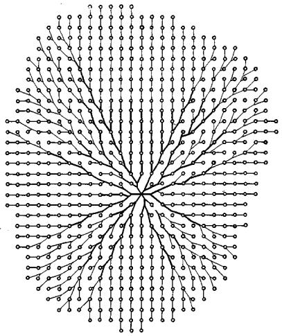 Рис. 43, Квартал № 10. Проект пешеходной сети (вариант 3). По сравнению с вариантом 2 плотность сети в варианте 3 уменьшена за счет сокращения числа исходных точек (в качестве исходных точек принимаются не все подъезды жилых ломов, а через один) 3.2.4. Сопоставим основные характеристики трех рассмотренных вариантов сети в квартале № 10 Химки-Ховрино, а также средние показатели по ряду реальных проектов, выполненных в ЦНИИП градостроительства традиционным образом, без применения настоящей методики (микрорайоны Липецка, Владивостока, Караганды и некоторых других городов). Плотность сети в варианте 2 на 42,5%, а в варианте 3 почти вдвое меньше, чем плотность сети в варианте 1. Очевидно, что цель, поставленная при разработке этих вариантов, успешно достигнута. Наряду с уменьшением плотности сети, благотворно отражающемся на озеленении квартала, снижаются и затраты на ее строительство, так как общая площадь покрытий пешеходных дорог во втором варианте на 25,2%, а в третьем на 30,7% ниже, чем в первом (отличие от соотношения показателей по длине сети объясняется увеличением ширины некоторых ее участков в связи с увеличением потоков по ним по мере уменьшения плотности сети). Плотность сети в среднем по группе традиционных проектов занимает промежуточное положение между первым и вторым вариантами, но ее комфортные характеристики значительно хуже. 3.2.5. Создание рациональной системы искусственных препятствий полезно во многих случаях не только как средство разуплотнения сети пешеходных путей, но и с точки зрения решения ряда планировочных задач, связанных с функциональным зонированием территории жилого комплекса, в частности, для создания зон, изолированных от транзитного пешеходного движения и предназначенных для таких функций, как тихий отдых и спорт. В этом случае в качестве системы препятствий мы должны рассматривать прежде всего саму жилую застройку. Гибкость и устойчивость пешеходных сетей. Учет эстетических факторов 3.2.6. В комплексе вопросов, возникающих при решении задач планировки и застройки, в том числе при взаимосвязанном решении жилой застройки и пешеходной сети в жилом комплексе, существенную роль играют вопросы эстетического характера. Композиция застройки воспринимается в динамике, в процессе движения пешехода по маршрутам реально функционирующей пешеходной сети. В какой мере вопросы эстетического восприятия застройки могут быть учтены при конструировании сети пешеходных путей? До сих пор мы фиксировали свое внимание исключительно на той конфигурации сети, которая является решением оптимизационной задачи. Рассматривая такое решение как базовое, исходное, мы можем подвергнуть его мягкой корректировке (см. раздел 3.1) с целью учета дополнительных соображений - эстетических и климатических. В некоторых случаях имеет смысл учитывать эти факторы с самого начала, включая, например, важные видовые точки в число целевых точек. При проектировании парков некоторым прямолинейным участкам на прогулочных маршрутах можно придавать мягкую криволинейность. Удлинение сети при этом столь незначительно (до 5% на корректируемых участках и до 0,5% в целом по сети), что оно не может служить препятствием для такого рода корректировок. Принятие подобных допущений придает всей рассматриваемой методике, а вместе с ней и конструируемой сети 