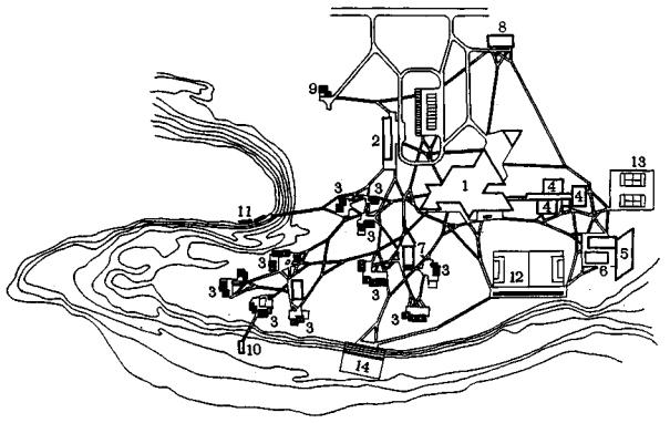 1 - общественный центр; 2 - административный блок; 3 - летние жилые помещения; 4 - зимний жилой корпус; 5 - спортивный зал; 6 - открытый бассейн; 7 - санитарные узлы; 8 - дом для обслуживающего персонала; 9 - летний изолятор; 10 - душевая на пляже; 11 - лодочная станция; 12 - футбольное поле; 13 - теннисные корты; 14 - спортивная площадка Рис. 46. Пешеходная сеть молодежного лагеря "Айнур" (проект) |