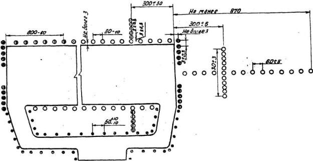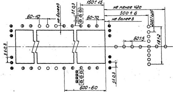3.66. Дополнительно к огням приближения ОВИ-1 (см. рис. 3) на участке протяженностью 270 м от порога ВПП должны быть установлены линейные боковые огни КПБ в виде двух продольных рядов. Количество арматур в линейном ряду огней бокового ряда я расстояние между ними должно соответствовать количеству арматур и расстояние между ними в огнях зоны приземления. 3.67. Продольный интервал между линейными боковыми огнями должен быть равным интервалу между огнями приближения осевого ряда. 3.68. На расстоянии 150 м от порога ВПП должен быть установлен световой горизонт, совпадающий с пятым рядом центральных огней. Огни светового горизонта должны быть равномерно размещены с интервалом, как правило, 2,7 м, но не менее 1 м и должны заполнить расстояние между огнями центрального ряда и боковыми огнями КПБ. 3.69. В системах ОВИ-2 (см. рис. 7) дополнительно к огням приближения ОВИ-1 (см. рис. 4) должны быть установлены: два ряда боковых огней КПБ аналогично п. 3.66; по два огня с каждой стороны от одинарных огней с интервалом 1,0±0,1 м общей шириной 4,0±0,4 м на участке 0-300 м от порога ВПП 3.70. Входные огни должны быть расположены равномерно вдоль порога ВПП не далее 3 м с внешней стороны от него с интервалом между огнями 3,0±0,3 м. Схема размещения огней приведена, на рис. 8.
