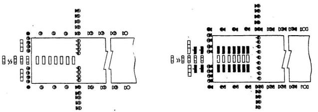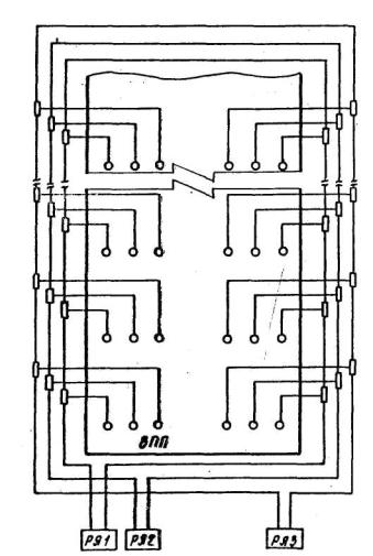 Рис. 17. Схема электропитания прожекторных боковых огней КПБ при дооборудовании системы ОВИ-1 до ОВИ-2 и ОВИ-3 с огнями приближения по центральному ряду огни зоны приземления систем ОВИ-2 и ОВИ-3 с огнями приближения по центральному ряду (рис. 18); посадочные входные и ограничительные огни прожекторного типа систем ОВИ-1 (рис. 19); посадочные и ограничительные огни прожекторного типа систем ОВИ-2 и ОВИ-3 (рис. 3); входные огни прожекторного типа систем ОВИ-2 и ОВИ-3 (рис. 20). При установке входных огней углубленного типа вдоль торца ВПП огни фланговые огни прожекторного типа должны включаться в кольцо посадочных огней; осевые огни ВПП (рис. 21); посадочные огни линзового типа, входные и ограничительные прожекторного типа систем ОВИ-1 (рис. 22); посадочные огни линзового типа и ограничительные огни прожекторного типа систем ОВИ-2 и ОВИ-3 (рис. 23). От одного регулятора яркости по одной кабельной линии должны включаться: огни приближения и светового горизонта кругового обзора по схеме на рис. 4, в системах ОВИ-1 и ОВИ-2 по схемам на рис. 3; огни приближения кругового обзора устанавливается при наличии задания на проектирование; входные, посадочные, ограничительные огни кругового обзора (с использованием второго резервного регулятора яркости) систем ОВИ-1, ОВИ-2 и ОВИ-3; огни приближения в светосигнальных системах ОМИ (см. рис. 24); глиссадные огни типа PAPI (см. рис. 24); огни ВПП в светосигнальных системах ОМИ (см. рис. 24) В системах ОМИ, предназначенных для полетов по ППП (см. рис. 2) электропитание посадочных, входных и ограничительных огней кругового обзора (совместно) осуществляется по двум кабельный линиям. 4.3. Электропитание импульсных огней приближения выполняется по схеме в соответствии с технической документацией на тип оборудования.