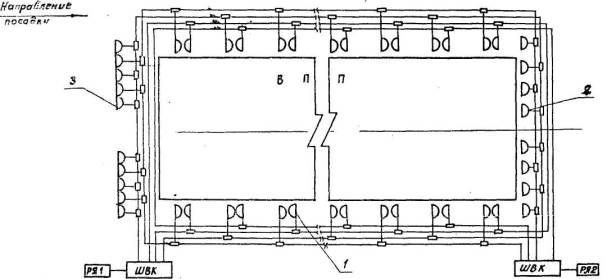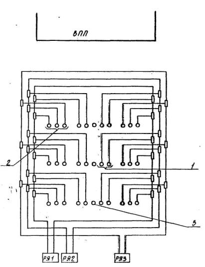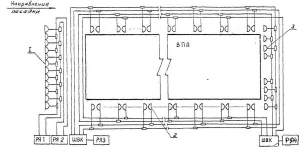 Рис. 13. Схема электропитания прожекторных огней центрального ряда и боковых огней на КПБ систем ОВИ-2 со световыми горизонтами: 1 - огни КПБ центрального ряда прожекторные; 2 - огни КПВ бокового ряда прожекторные; 3 - осевые огни КПБ прожекторные