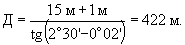 При наличии JLS система PAPI должна устанавливаться у точки пересечения глиссады JLS с ВПП. Однако, в связи с разностью в уровнях расположения глаз пилота и приемника излучений ГРМ для большинства самолетов место установки системы PAPI смещается от точки пересечения глиссады JLS с ВПП в сторону увеличения расстояния Д1, но не более, чем на 120 м, для ВПП с кодовым номером 4. Расстояние Д1 в данном случае рассчитывается путем прибавления высоты уровня глаз пилота над приемником излучения ГРМ к высоте опорной точки и деления полученной суммы на тангенс угла возвышения минус 2' огня № 2. Пример 2 Высота уровня порога и глиссадных огней одинакова. Угол глиссады............................ 2°40' Угол возвышения огня № 2................. 2°30' Высота опорной точки ............. ......... 15 м Высота уровня глаз пилота над приемником излучения ГРМ ............................. 1 м Расстояние глиссадных огней от порога ВПП