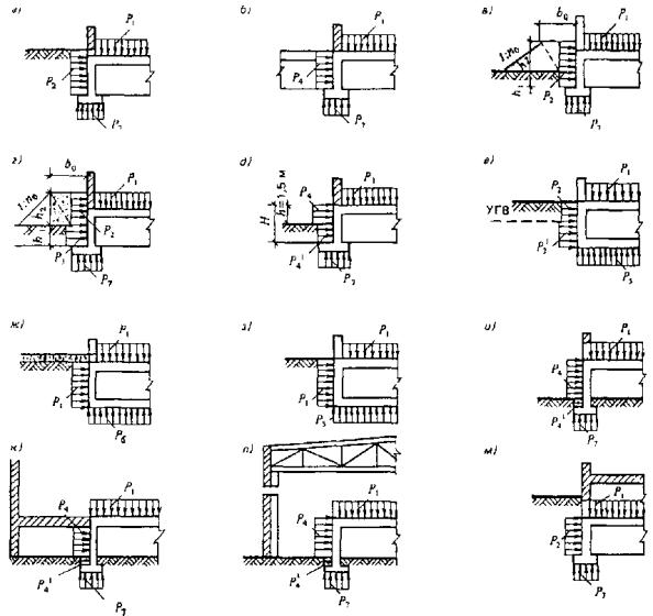 3.9*. Динамическую горизонтальную нагрузку P4 для участков наружных стен, необвалованных и возвышающихся над поверхностью земли, непосредственно воспринимающих нагрузку от ударной волны (рис. д, и), следует определять с учетом эффекта обтекания сооружения ударной волной. При высоте выступающих частей стен убежища над поверхностью земли 1,5 м и менее (рис. д) динамическую нагрузку следует определять: а) для отдельно стоящих убежищ и встроенных убежищ в здания, стены которых имеют площадь проемов 10 % и более, по формуле б) для встроенных убежищ в здания, стены которых имеют площадь проемов менее 10%, по формуле При высоте выступающей части стен над поверхностью земли более 1,5 м динамическую нагрузку на стены отдельно стоящих и встроенных убежищ (рис. и) следует определять по формуле (5а). Для стен встроенных убежищ, находящихся за ограждающими конструкциями первого этажа зданий (рис. к, л), динамическую нагрузку следует принимать: при площади проемов стен здания от 10 до 50% - по формуле (5); при площади проемов более 50 %, а также для стен убежищ, находящихся за легко разрушаемыми конструкциями, - по формуле (5а); при площади проемов менее 10% - по формуле где P1 = 0,9 DР Динамическую горизонтальную нагрузку P¢4 передаваемую через грунт (рис. д, и, к, л), следует определять по формуле Р¢4 = КбР4. (5в) где Кб - коэффициент бокового давления, принимаемый по табл. 11; Р4 - нагрузка на участки стен и стены, не обвалованные грунтом. При типовом проектировании для встроенных в первые этажи убежищ расчетную нагрузку на стены следует принимать: для убежищ, находящихся за кирпичными, блочными и панельными ограждениями конструкций, - по формуле (5), за легко разрушаемыми конструкциями - по формуле (5а). 3.10. Динамическую нагрузку Р5 на сплошную фундаментную плиту (рис. е) на основаниях из нескальных грунтов и при условии, что толщина слоя грунта под фундаментной плитой до скалы равна или больше величины заглубления сооружения в грунт, следует принимать равной давлению во фронте ударной волны DР. При толщине слоя нескального грунта от низа фундаментной плиты до скалы меньше величины заглубления сооружения динамическую нагрузку P5 следует принимать разной величине давления во фронте ударной волны DР, умноженной на коэффициент 1,2. 3.11. Динамическую нагрузку Р5 на сплошную фундаментную плиту (рис. г) на вечномерзлых грунтах при использовании основания по принципу II следует принимать равной величине давления во фронте ударной волны DР. Динамическую нагрузку Р6 на сплошную фундаментную плиту (рис. ж) на вечномерзлых грунтах при использовании основания по принципу II следует принимать равной величине давления во фронте ударной волны DР, умноженной на коэффициент 1,2. 3.12. Динамическую вертикальную нагрузку на колонны, внутренние и наружные стены следует определять расчетом в зависимости от площади загружения и динамической нагрузки на покрытия, определяемой по п. 3.5 настоящих норм. Динамическую нагрузку P7 на ленточные отдельно стоящие фундаменты следует определять расчетом в зависимости от динамической вертикальной нагрузки на стены, колонны и площади фундаментов. 3.13*. Динамическую горизонтальную нагрузку на участки наружных стен убежищ в местах расположения входов и на первые (наружные) защитно-герметические двери (ворота) следует определять в зависимости от типа входа, его распол