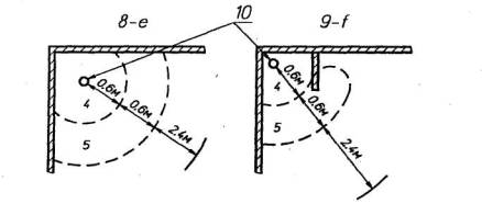 зонах 1—3 с такими же частями, выходящими за пределы ванных и душевых