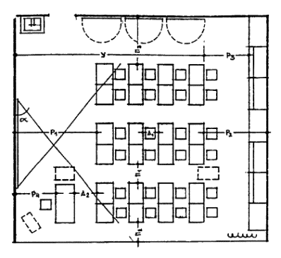 - Угол рассматривания классной доски не менее 35 градусов в соответствии со СП 2.4.2.782-99 (в помещениях для учащихся начальной школы - 45 градусов). - Расчетная длина классной доски 300 см. - Расчетная точка положения ученика: середина ученического места первого крайнего ряда столов. - р1 - расстояние от передней стены с классной доской до передних столов (при трехрядной расстановке), не менее. - Р2 - расстояние от ученических столов до задней стены (перегородки, шкафа), не менее, - П2 - расстояние между рядами столов и наружной продольной стеной, не менее. - П3 - расстояние от ученических столов до внутренней стены (перегородки шкафа) не менее. СОДЕРЖАНИЕ