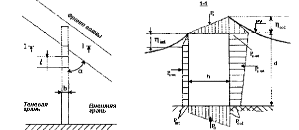 Волновое давление на средние и корневые элементы буны, расположенные, соответственно, в приурезовой зоне и за линией уреза в пределах наката волны, определяются с учетом положений п. 3.3 главы 3 СНиП 2.06.04-82* [1]. 6.2.8 Для расчета нагрузок на упорный элемент подводного банкета применяются положения п. 3.1 главы 3 СНиП 2.06.04-82* [1] с небольшими изменениями: максимальные значения горизонтальной Рх, кН/м и вертикальной Рz и Рc, кН/м, проекций равнодействующей линейной нагрузки от волн при ложбине волны необходимо принимать по эпюрам бокового и взвешивающего волнового давления (рисунок 6.2), при этом значения р, кПа, должны приниматься в зависимости от Z по формулам: Z = Z1 при Z1 ³ Z2 Z = Z3 = d, Р3 = P2, (6.6) где: Z1 - ордината верха сооружения, м; Z2 - ордината подошвы волны, м, определяемая по табл. 16 п. 3.1 главы 3 СНиП 2.06.04-82* [1]; Z3 - ордината поверхности воды за упорным элементом подводного банкета, м, определяемая по формуле (73) п. 3.1 главы 3 СНиП 2.06.04-82* [1]; Z4 - ордината гребня волны перед упорным элементом подводного банкета, принимаемая по табл. 16 п. 3.1 главы 3 СНиП 2.06.04-82* [1]. Рисунок 6.2 - Эпюры волнового давления на упорный элемент подводного банкета 6.2.9 Нагрузки и воздействия на проницаемые берегозащитные сооружения, представляющие собой относительно тонкую проницаемую стенку, которая может состоять из колонн или свай с зазорами между ними, железобетонных плит с отверстиями, ступенчатых конструкций и др. определяются согласно рекомендациям, изложенным в методике [18]. Схема взаимодействия волн с