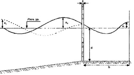 0,1 Рисунок 6.3 - Взаимодействие волн с проницаемым сооружением: d - глубина воды у стенки; d - толщина проницаемой стенки; b - ширина волновой камеры; а0 - амплитуда подходящих волн; a1 - амплитуда прошедших волн; а2 - амплитуда отраженных волн Расчет нагрузок от волн на проницаемые сооружения включает: определение расчетной глубины и параметров волн в месте установки сооружения, которые выполняются согласно положениям СНиП 2.06.04-82* [1] и главы 5 настоящего Свода правил; определение коэффициента гидравлического сопротивления проницаемой стенки согласно рекомендациям [19, 20]; определение коэффициента отражения и прохождения волн; определение нагрузок от волн на проницаемую стенку и величины заплеска. Коэффициент отражения волн от проницаемой стенки с волновой камерой определяется по формуле: