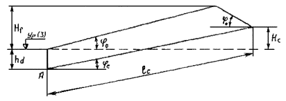 допускается принимать 6.3.21 Протяженность навала льда на береговой откос или откос сооружения вдоль линии берега устанавливается по результатам натурных наблюдений за морфологией подводной зоны на рассматриваемом участке побережья. При этом, случай навала льда, вычисляемый по формулам (6.23 - 6.25), относится к наиболее опасным зонам: вершине подводного каньона, близко подходящего к урезу воды; наиболее приглубому месту дна; участку берега, расположенному по нормали к продольной оси монолитного ледяного поля и т.д. 6.3.22 Угол откоса jc, рад., по которому происходит однослойный надвиг льда на сооружение, следует считать угол между горизонтом и линией, соединяющей точку А с бровкой сооружения (см. рисунок 6.5). 6.3.23 При необходимости защиты от ледового воздействия транспортных магистралей и других народнохозяйственных объектов, расположенных в зоне расчетного надвига льда и его навала, возможно создание в приурезовой зоне берм из скального грунта шириной, превышающей ширину однослойного надвига льда на откос, т.е.