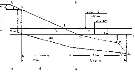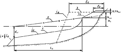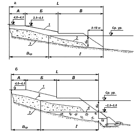 где: Lx - протяженность элементарного участка искусственного свободного песчаного пляжа, м; SQ2 - SQ1 - изменение результирующего вдольберегового потока наносов за заданный промежуток времени в выходящем створе Q2 элементарного участка пляжа по отношению к соответствующему потоку наносов Q1 во входящем створе. 7.2.17 Расчет исходного удельного (на одном погонном метре береговой линии) объема песчаного материала, необходимого для формирования профиля относительного динамического равновесия искусственного пляжа, осуществляется путем наложения этого профиля на профиль естественного берегового склона на защищаемом участке побережья. 7.2.18 Построение профиля относительного динамического равновесия производится следующим образом: на поперечном профиле естественного берегового склона откладывается отметка мористого края бермы искусственного пляжа и от нее горизонтальной линией в сторону моря откладывается ширина ее заложения (см. рисунок 7.1); от мористого края бермы искусственного пляжа уклоном in откладывается длина наката расчетной волны на береговой откос до высшей точки волнового нагона, от которой строится профиль относительного динамического равновесия подводного берегового склона искусственного пляжа до глубины dcr. Если глубина моря в конце расчетного профиля превышает глубину dcr, то его мористое окончание соединяется с дном линией с уклоном 1/3iе (см. рисунок 7.1). 7.2.19 Удельный объем песчаного материала, необходимый для формирования профиля относительного динамического равновесия, численно равен площади графика, лежащего выше профиля естественного берегового склона. Общий объем отсыпки или намыва пляжеобразующего материала на защищаемом участке побережья определяется как сумма средних удельных объемов между смежными поперечными профилями на длину защищаемого участка берега. 7.2.20 Песок, необходимый для создания и периодического пополнения свободных пляжей, может разрабатываться в материковых или в морских подводных карьерах. Зерновой и минералогический состав песка является одним из основных показателей экономической эффективности создания искусственных свободных песчаных пляжей. Крупность песка свободных пляжей должна быть по возможности большей или равной крупности песка естественных пляжей на укрепляемом участке побережья. Допускается содержание в песке гравийно-галечных фракций. 7.2.21 Искусственное пополнение свободных пляжей песчаным материалом, включая байпассинг, можно осуществлять следующими средствами: наземными установками, работающими по принципу обычного землесоса; плавучими трюмнорефулерными землесосами или ковшовым земснарядами; наземным транспортом, в т.ч. автосамосвалами, скреперами и др. 7.2.22 Местоположение выпуска напорного трубопровода на защищаемом берегу должно увязываться с размещением питающих отсыпок песка. Искусственные питающие отсыпки размещаются с учетом гидро- и литодинамических условий прибрежной зоны моря и в соответствии с технико-экономической целесообразностью. Наиболее удобным местом размещения питающей отсыпки в большинстве случаев является верхняя часть размываемого берега, считая по направлению господствующего движения насосов. При наличии экономической целесообразности питающие отсыпки допускается размещать в нескольких местах вдоль защищаемо