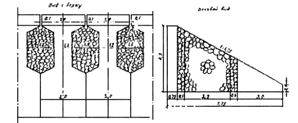 по высоте внешней и теневой граней буны, принимаемый в зависимости от глубины у