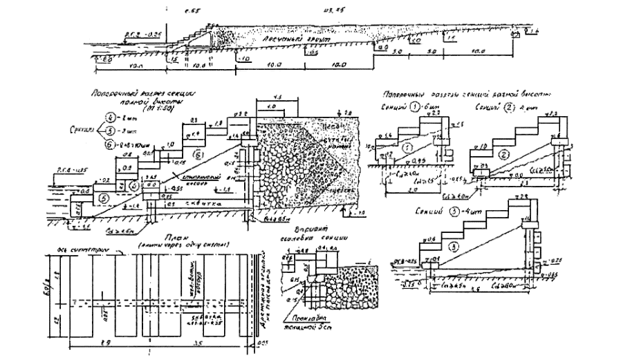 Примечания: 1) Значения коэффициента запаса, полученные по расчетам, не должны быть менее указанных в таблице, а один из них, являющийся лимитирующим, не должен превышать эти значения более чем на 15 %. 2) Когда вероятности превышения (обеспеченность) расчетных уровней и высот волн, указанных в таблице, не отвечают фактически возможным сочетаниям (период стояния высоких уровней не совпадает с периодом сильных штормов), расчетный уровень допускается определять только для периода сильных штормов. 3) Числитель - высота волны в режиме, знаменатель - то же в системе. 4) Для сооружений VI класса капитальности на отмелых берегах (i < 0,03) к отметке расчетного уровня рекомендуется добавлять величину ветро-волнового нагона, определяемого для исходных расчетных параметров ветра и волн. *) Меньшие значения соответствуют плотным осадочным породам, не нарушенным трещинами; большие - полускальным (аргилитам и др.). Расчеты сооружений на устойчивость и прочность производятся на допускаемые нагрузки. 6.1.3 Расчетные элементы волн следует принимать с учетом подверженности берегозащитного сооружения воздействию необрушенных, обрушающихся или разрушенных волн, а также с учетом геометрических характеристик, проницаемости и сквозности сооружения. Интенсивность волнового воздействия, испытываемого сооружением, может изменяться вдоль сооружения с изменением уровня воды и во времени (в ходе шторма и в течение волнового периода). Поэтому волновые условия должны быть определены в разных сечениях вдоль сооружения и при разных уровнях воды. 6.1.4 Для проверки устойчивости морских берегозащитных сооружений из гравитационных массивов на сдвиг рекомендуется принимать следующие значения коэффициентов трения бетона по основанию: по поверхности прочной скалы и каменной наброски - 0,50, по известнякам и песчаникам - 0,30 - 0,45, по галечно-песчаному грунту береговых отложений - 0,40, по пескам пляжевых отложений - 0,30, по плотным глинистым сланцам и мергелям с неомыливающейся поверхностью - 0,25 - 0,35, по глинам и суглинкам, а также глинистым сланцам и мергелям и другим грунтам с смыливающейся поверхностью - 0,20 - 0,25. 6.1.5 Глубину заложения подошвы бун и подводных волноломов следует назначать с учетом свойств грунтов основания по табл. 6.1, а также с учетом долговременных и сезонных понижений поверхности пляжа и подводного берегового склона. 6.1.6 Принятые в проекте глубины размыва в нескальных грунтах должны обосновываться материалами изысканий, в том числе результатами анализа береговых процессов, и опытом строительства морских берегозащитных сооружений. Глубина размыва в скальных грунтах условно принимается равной верхнему слою породы, разрушенному физико-механическими процессами. 6.1.7 Величину заглубления подошвы фундамента гравитационных сооружений ниже расчетной глубины размыва необходимо принимать с учетом класса берегозащитных сооружений по табл. 6.1. 6.1.8 Подошва фундамента волноотбойных стен, корневых частей бун и траверсов должна располагаться на 0,2 - 0,3 м ниже глубины промерзания грунтов. 6.1.9 В случае, если грунты в основании берегозащитного сооружения не удовлетворяют требованиям несущей способности или устойчивости против размыва, следует предусматривать их замену каменными постелями. 6.1.10 При проектировании оснований берегозащитных сооружений следует учи