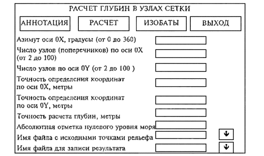 Приложение ЕОПИСАНИЕ ПРИМЕНЕНИЯ ПРОГРАММЫ ПРИВЕДЕНИЯ ГЛУБИН В УЗЛЫ РЕГУЛЯРНОЙ ПРЯМОУГОЛЬНОЙ СЕТКИНазначение программы Программа предназначена для построения прямоугольной координатной сетки и вычисления глубин в узлах этой сетки на основе данных о рельефе, заданных произвольным набором точек или по поперечникам. Такая сетка необходима для проведения расчета трансформации и рефракции волн, а также для построения плана изобат или любых других изолиний. Программа может быть использована для работы вычислительных комплексов, связанных с восстановлением картины любых физических полей, являющихся потенциальными, по данным в отдельных произвольных точках. Описание метода расчета Вводится прямоугольная система координат с началом в левом верхнем углу, в которой ось OX направлена вдоль берега слева направо, а ось OY развернута на 90 градусов по часовой стрелке в сторону моря. Ось OZ направлена вниз, так что точки рельефа, расположенные ниже нулевого уровня моря, имеют положительные значения Z-координат, а расположенные выше нулевого уровня - имеют отрицательные Z-координаты. По оси OX узлы сетки нумеруем по индексу М = 1 ... Мmax, а по оси OY - по индексу N = 1 ... Nmax, при этом глубина в отдельном узле сетки обозначается Z[M,N], а глубина в отдельной произвольно расположенной точке - ZJ[J]. Таким образом, непрерывное поле глубин Z(x,y) в некоторой области S описывается дискретным набором значений ZJ[J] в известных точках и восстанавливаемых значений Z[M,N] в узлах расчетной сетки. При этом требуется обеспечить необходимую точность восстановленного рельефа при минимизации количества J исходных точек рельефа. Для правильного отображения рельефа в границах точности должно сохраняться число особенностей рельефа - число положительных, отрицательных форм и седловин [32]. Для этого необходимо, чтобы массив исходных точек рельефа ZJ включал в себя все характерные точки, отражающие структуру рассматриваемого рельефа. Если исходных точек недостаточно - на восстановленной карте могут возникать несуществующие на прототипе положительные и отрицательные формы. Поэтому соблюдение данного условия необходимо для успешного применения программы и далее предполагаем, что исходных точек достаточно для восстановления всех особенностей рельефа. В основу метода расчета положен вариационный подход к решению задачи интерполяции физических полей [33], который основан на том, что определяется некоторое число - функционал, называемый критерием качества. Достижение соответствующего экстремума означает наилучшее решение поставленной задачи. Необходимо отметить, что конкретный вид критерия качества для каждого класса задач интерполяции может быть сформулирован только исследователем на основе имеющегося опыта или точного представления о том, какая именно характеристика восстанавливаемого распределения должна принять экстремальное значение. Для настоящей задачи критерий качества определяется путем ввода условия на поведение восстановленного значения Z[M,N] между известными точками ZJ[J]. Традиционные методы интерполяции не налагают таких условий. По этой причине поведение восстановленного распределения между известными точками оказывается иногда неправдоподобным, например, если для интерполяции используются многочлены высокой степени. Для выбора ограничения, 