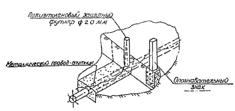 Проектное решение относительно пересечения полиэтиленового газопровода с каналом теплосети в каждом конкретном случае должно приниматься с учетом возможности расположения газопровода выше или ниже канала. 2.5. Допускается для присоединения полиэтиленовых труб к стальным осуществлять выход полиэтиленовых труб из земли на высоту не более 0,8м с устройством защитного металлического футляра. Эксплуатация цокольных вводов и надземных выходов может производиться при t° не ниже -40°С. 2.6. При проектировании газопроводов высокого давления, подводящих газ к населенному пункту, использование полиэтиленовых труб должно заканчиваться не менее, чем за 50 м до жилой застройки. 2.7. Допускается предусматривать прокладку в одной траншее двух и более полиэтиленовых или полиэтиленового и стального газопроводов. При этом расстояние между газопроводами следует принимать из условия возможности производства работ по монтажу и ремонту. Совместная прокладка газопроводов с кабельными линиями не допускается. 2.8. Максимальный уклон газопроводов из полиэтиленовых труб не должен превышать 1:2. Если уклон превышает 1:2, следует проводить планировку трассы до указанного значения или соответствующее заглубление газопровода, обеспечивающее допустимый уклон. Для газопроводов, прокладываемых на сезонно подтопляемых территориях и на местности с уклоном свыше 1:5 и подверженной эрозии, следует предусматривать проектные решения по предотвращению размыва траншеи (водоотведение, одерновка, каменная наброска, геотекстиль и т.д.). 2.9. Обозначение трассы полиэтиленового газопровода за пределами населенного пункта следует предусматривать: или путем установки опознавательных знаков, располагаемых на расстоянии не более 500 м друг от друга, а также на поворотах, в местах ответвлений и расположения контрольных трубок, или при отсутствии постоянных мест привязки путем прокладки вдоль газопровода изолированного алюминиевого или медного провода сечением 2,5-4 мм2, с выходом концов его на поверхность. Опознавательные знаки следует располагать на расстоянии 1 м от оси газопровода, справа по ходу газа. Отклонение провода от оси трубы при прокладке не должно превышать 0,3 м. В случае использования для обозначения трассы газопровода изолированного провода опознавательные знаки допускается устанавливать только в местах вывода провода над поверхностью земли и в местах расположения контрольных трубок. Вывод провода-спутника над поверхностью земли должен предусматриваться в специальных контрольных точках, располагаемых на расстояниях не более 4,0 км друг от друга (рис. 1). 2.10. Рекомендуемая форма "Общих указаний" к проекту газоснабжения, располагаемая на листе общих данных, приведена в Приложении 5. Кроме "Общих указаний" на первом листе проекта должен быть изображен ситуационный план газопровода в масштабе с указанием участков, выполненных из полиэтиленовых и стальных труб, а также разбивка трассы по листам проекта. 2.11. В проекте должен учитываться запас труб в размере 2% от общей протяженности газопровода, предназначенный на укладку труб змейкой, проведение входного контроля качества материала труб, сварку допускных стыков, изготовление узлов разъемных соединений, а также аварийный запас, используемый для устранения повреждений полиэтиленовых труб, которые могу