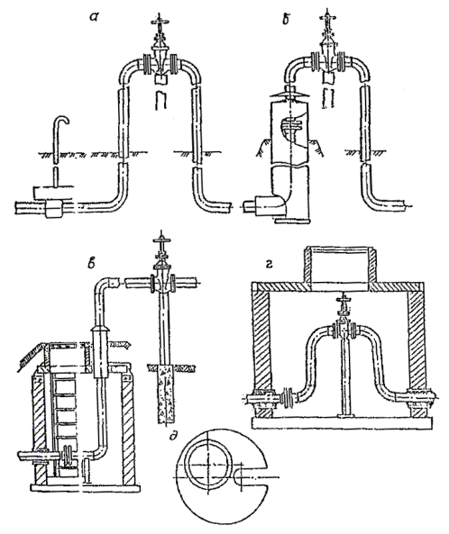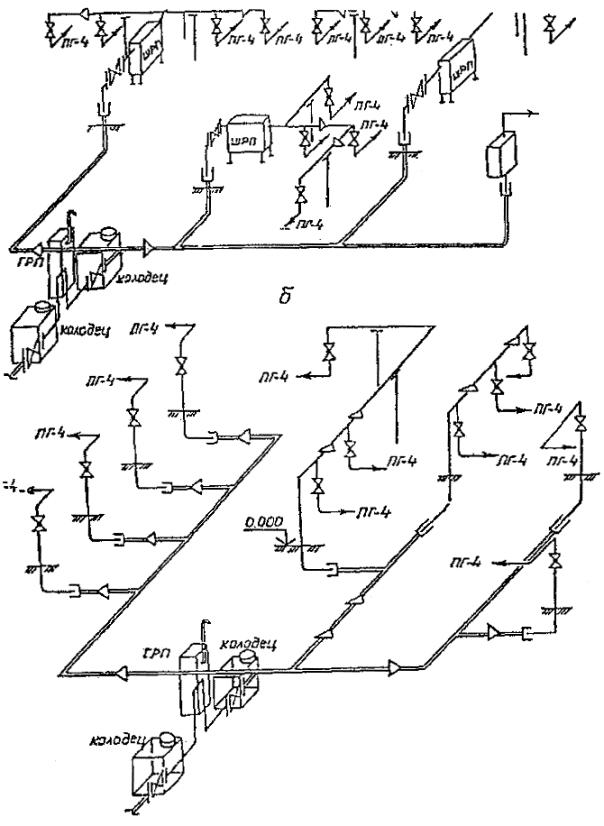 Рис 3. Схемы размещения запорной арматуры и компенсаторов При соответствующем обосновании с учетом местных климатических и инженерно-геологических условий и свойств полиэтилена допускается выполнять цокольные вводы полиэтиленовых газопроводов до мест их присоединения к шкафным регуляторным пунктам (далее ШРП) и комбинированным регуляторам давления, с выходом полиэтиленовой трубы на высоту до 0,8 м от поверхности земли при условии заключения ее с узлом соединения в металлический футляр. Конструкция ввода должна содержать технические решения по компенсации температурных и других возможных нагрузок и воздействий на полиэтиленовый ввод. Не рекомендуется предусматривать вводы из полиэтиленовых труб в сильнопучинистых грунтах. Размещение запорной и другой арматуры на газопроводах 4.8. Запорную и другую арматуру на полиэтиленовых газопроводах следует предусматривать как для стальных газопроводов. Допускается установка полиэтиленовых кранов в грунте (без колодца) при условии размещения их в футляре или другой защитной конструкции. 4.9. Запорная арматура может располагаться подземно и наземно. Для подземного расположения рекомендуется использовать колодцы, для наземного - специальные площадки, имеющие стационарное ограждение. При наземном размещении запорной арматуры газовые колодцы могут использоваться для вывода стальных труб над поверхностью земли. Расположение маховика арматуры рекомендуется предусматривать на высоте не более 1,8 м от уровня дна колодца или площадки обслуживания. 4.10. Присоединение полиэтиленовых газопроводов к запорной арматуре может быть как непосредственное, при помощи узлов разъемных фланцевых соединений, так и через стальные вставки. Варианты монтажа и размещения запорной арматуры на полиэтиленовых газопроводах и компенсаторов на стальных газопроводах приведены на рис. 3 и 4. 4.11. Для исключения дополнительных напряжений в узлах разъемных фланцевых и неразъемных соединений "полиэтилен-сталь", под наиболее металлоемкие детали должны предусматриваться опоры. Переходы газопроводов через естественные и искусственные препятствия 4.12. Переходы газопроводов через железные дороги общей сети и автомобильные дороги I-II категорий, под скоростными дорогами, магистральными улицами и дорогами общегородского значения, а также через водные преграды шириной более 25 м при меженном горизонте и болота III типа должны выполняться из стальных труб. При пересечении железных дорог переход на стальные трубы должен осуществляться на расстоянии не менее 60 м до и после земляного полотна насыпи, бровки выемки или крайнего рельса на нулевых отметках. Пересечение газопроводов с железными и автомобильными дорогами следует предусматривать, как правило, под углом 90°. Характеристики дорог по категориям приведены в Приложении 11. Подразделение болот на типы приведено в Приложении 12. 4.13. Пересечение болот I и II типов и водных преград шириной до 25 м при меженном горизонте и отсутствии эрозии дна и берегов допускается осуществлять из полиэтиленовых труб. Проектную отметку верха забалластированного газопровода следует принимать на 0,5 м ниже прогнозируемого профиля дна, а на судоходных и сплавных реках - на 1 м, определяемого с учетом возможного размыва русла реки в течение 25 лет эксплуатации. a) – надземное, с использо