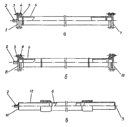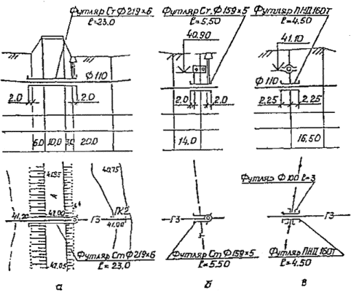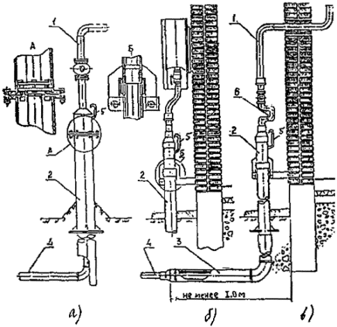 4.27. С целью избежания повреждения поверхности полиэтиленовой трубы при протаскивании ее через металлический или асбестоцементный футляр следует предусматривать защиту ее поверхности с помощью колец изготавливаемых из труб того же диаметра, длиной 0,5 dе, путем разрезки их по образующей и установки (после нагрева) на протягиваемую трубу на расстояниях 2-3 м друг от друга и закрепления на трубе липкой синтетической лентой. 4.28. В местах выхода полиэтиленовых труб над поверхностью земли (до высоты 0,8 м) и местах расположения полиэтиленовых цокольных вводов надземные участки полиэтиленовых труб вместе с узлом соединения "полиэтилен-сталь" должны быть заключены в защитные металлические футляры. При расположении цокольных вводов непосредственно у стен зданий (сооружений) в защитный футляр должен заключаться как вертикальный, так и горизонтальный участки ввода. Расстояние от наружной стены здания до конца горизонтального участка футляра должно быть не менее 1 метра. В футлярах надземных выходов и цокольных вводов могут размещаться (как разъемные, так и неразъемные узлы соединений "полиэтилен-сталь". Диаметр футляров принимается по данным табл. 2. Фланцы узлов разъемных соединений и стальные патрубки узлов неразъемных соединений должны жестко фиксироваться внутри металлических футляров для исключения воздействия на узлы соединений нагрузок от веса кранов, задвижек, температурных деформаций стальных участков и пр. В целях предохранения наземного полиэтиленового газопровода от механических повреждений внутри металлического защитного футляра должен устанавливаться полиэтиленовый или полипропиленовый патрубок. Надземный стальной участок газопровода до места присоединения к домовому регулятору давления или ввода в дом, в этом случае должен иметь угловой или П-образный компенсатор (рис. 8). Размеры компенсатора должны определяться расчетом, на основании учета перемещений газопровода (включая надземный и подземный участки) от температурных воздействий и давления газа. На рис. 8 показаны возможные варианты конструкций футляров для цокольных вводов и надземных выходов полиэтиленовых труб, монтируемых в простых геологических условиях, при отсутствии: - пучинистых, просадочных, набухающих, неслежавшихся насыпных грунтов; - подрабатываемых территорий; - возможности развития опасных геологических процессов (карст, оползни и др.); - сейсмичности. Конструкция цокольных вводов и надземных выходов полиэтиленовых труб, монтируемых в сложных геологических условиях, должна определяться специально разработанными техническими решениями, утвержденными в установленном порядке. 4.29. Размеры колодцев, рекомендуемых для полиэтиленовых газопроводов, должны соответствовать типовому проекту 905-7 "Унифицированные колодцы для подземных газопроводов". Колодцы, предусматриваемые в пучинистых грунтах, должны быть сборными железобетонными или монолитными. 4.30. Контрольные трубки следует предусматривать на одном конце футляров при пересечении газопроводом автомобильных и железных дорог, подземных коллекторов и каналов, водостоков, канализации и тепловых сетей, а также на стальных футлярах в местах выхода полиэтиленовых труб над поверхностью земли и в местах бесколодезного расположения разъемных соединений. Рис. 8. Конструкция футляров 