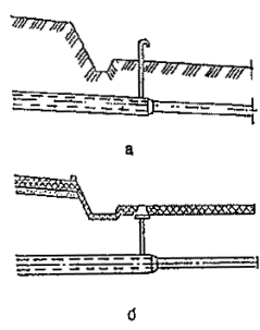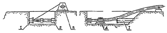 В случае, если плеть трубопровода охладится до предельно допустимой температуры, укладку необходимо приостановить, а бухту с оставшейся трубой вновь подогреть. Возможен вариант установки специального тепляка, подогреваемого выхлопными газами, или другими методами непосредственно на тяговый трактор укладочной машины, что обеспечит непрерывную укладку труб. 16.8. Скорость разматывания бухты - до 0,8-1,0 км/час. 16.9. Для устройства узких траншей с последующей укладкой трубопровода рекомендуется использовать малогабаритные цепные траншеекопатели, щеленарезные машины. Для совмещения рытья узких траншей (щелей) и укладки трубопровода могут быть использованы серийные машины с необходимым дооборудованием: дреноукладчик бестраншейный МД-4, экскаваторы-дреноукладчики ЭТЦ-206, ЭТЦ-208В, ЭТЦ-252А, ЭТЦ-165, ЭТЦ-134А (Брянского завода ирригационных машин), экскаватор роторный ЭТР-134А (Московский экспериментальный механический завод). 16.10. Узкие траншеи (щели), разработанные роторными и цепными экскаваторами, щеленарезными и трубозаглубительными машинами, могут быть засыпаны с помощью специального плуга, который осуществляет процесс засыпки непрерывно в сцепе с тягачом землеройно-укладочной машины. 16.11. Ножевые щелерезы применяются для укладки трубопроводов диаметром 20-110 мм бестраншейным способом (трубозаглубление). Ножевой трубозаглубитель состоит из трактора-тягача, ножевого щелереза, кассеты (выполняющей функции устройства по формированию упругого изгиба заданного очертания в зоне укладки) и щелезасыпщика. Эффективность данного метода укладки может быть повышена (в особенности при работе на относительно плотных грунтах) путем создания предварительной прорези в грунте (пропорки) или проведения работ по его рыхлению. Пропорку осуществляют либо тракторным рыхлителем, либо трубозаглубителем со снятой кассетой. Эту операцию выполняют однократно или многократно в зависимости от категории грунтов. Многократная пропорка производится поочередно в прямом и обратном направлениях. На предварительной стадии работ отрывают котлован для первоначального заглубления пропорочного инструмента. Во время пропорки нож пропорщика периодически очищают от увлекаемых им за собой корней, камней и т.п. 16.12. В основные работы по трубозаглублению входят: отрывка котлована для первоначального заглубления рабочего органа трубозаглубителя; монтаж конической заглушки на конце трубопровода для заправки трубопровода в кассету; заглубление и выглубление рабочего органа; очистка рабочего органа; укладка трубопровода; отрывка котлована для выглубления рабочего органа. 16.13. Щель после укладки трубопровода засыпают щелезасыпщиком, прицепленным к трубозаглубителю или отдельному трактору. 16.14. В слабых грунтах трубозаглубитель работает без буксировки. При возрастании сопротивления трубозаглубления, когда тяговой силы тягача недостаточно, используют дополнители - тягачи-буксировщики. Буксировщики сцепляются в кильватерном сцепе. Наиболее экономичным методом является буксировка с помощью тракторной лебедки. При этом трактор с лебедкой якорят либо с помощью якорной платформы, либо бульдозерного отвала. 16.15. Срезку крутых берегов на переходах с уклоном более 1:2 следует производить бульдозером в продольном направлении (по отношению к оси трубопровода) стр