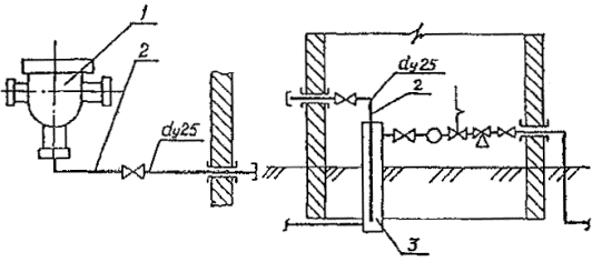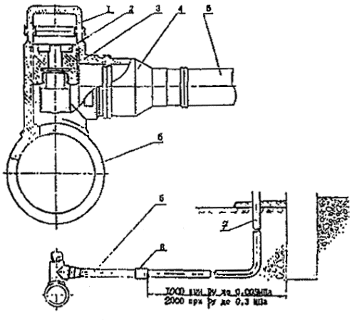 а - пример использования полиэтиленовых труб для внутрипоселкового газопровода среднего давления; б - пример использования полиэтиленовых труб для подземной части внутрипоселкового газопровода низкого давления Рис. 10. Схемы использования полиэтиленовых труб для строительства внутрипоселковых газопроводов Рис. 11. Присоединение стального газопровода-ввода к распределительному полиэтиленовому газопроводу при помощи тройникового узла врезки 1 - заглушка, 2 - фреза, 3 - тройник, 4 - переход, 5 – полиэтиленовый патрубок газопровода-ввода, 6 - труба распределительного газопровода, 7 – стальной цокольный ввод, 8 - соединение "полиэтилен-сталь" 5.5. Для предотвращения скапливания конденсата в газопроводных системах низкого давления следует, при необходимости, предусматривать конденсатосборники с уклоном к ним не менее 2%. Если по условиям рельефа местности не может быть создан необходимый уклон, допускается предусматривать прокладку газопровода с изломом в профиле с установкой конденсатосборника в низшей точке (рис. 12). 5.6. Трасса газопровода на территории населенного пункта должна обозначаться в местах поворотов и через каждые 200 м на прямолинейных участках с помощью привязки к зданиям, каменным оградам и т.д. Расстояние от газопровода до места привязки определяется рабочим проектом. Образец опознавательного знака приведен в Приложении 15. Для вновь проектируемых участков газопроводов на территории городов, как правило, должны предусматриваться технические решения, предупреждающие при выполнении земляных работ о прохождении на данном участке полиэтиленового газопровода. Например, укладка на расстоянии 0,25 м от верха трубопровода полиэтиленовой сигнальной ленты шириной не менее 0,2 м с несмываемой надписью "Газ". Для участков пересечений со всеми инженерными коммуникациями это требование обязательно. Лента должна быть уложена вдоль газопровода на расстояние не менее 2 м в обе стороны от пересекаемого сооружения. Рис. 12. Схемы удаления конденсата 1 - фильтр, 2 - газопровод для удаления конденсата, 3 - емкость переходная 6. РАСЧЕТ ГАЗОПРОВОДОВ НА ПРОЧНОСТЬ И УСТОЙЧИВОСТЬНагрузки и воздействия 6.1. Расчет газопроводов на прочность и устойчивость выполняется только для межпоселковых трубопроводов и его следует вести с учётом нагрузок и воздействий, возникающих при их сооружении, испытании в эксплуатации. Нагрузки, воздействия и их возможные сочетания необходимо принимать в соответствии с требованиями СНиП 2.01.07-85. 6.2. Нагрузки от собственного веса единицы длины газопровода должна определяться по формуле: qdw = prdwg(de - t)t, (1) 6.3. Нагрузка от давления грунта на единицу длины газопровода должна определяться по формуле: qgr = rgrgdeh, (н/м). (2) 6.4. Погонная выталкивающая сила воды, действующая на газопровод, находящийся ниже уровня грунтовых вод, должна определяться по формуле: