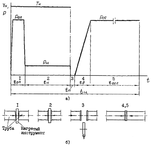 При сварке в условиях повышенных (выше плюс 30°С) или пониженных (ниже минус 5°С) температур окружающего воздуха температуры, приведенные для ТА в табл. 8, следует соответственно понизить или о повысить на 10°С. 11.1.13. Оплавление и нагрев торцов свариваемых труб и деталей осуществляют одновременно (синхронно) посредством их контакта с рабочими поверхностями нагретого инструмента. Оплавление торцов ведут при давлении Роп=0,15+0,05 МПа (1,5+0,5 кгс/см2) в течение времени tоп, достаточного для образования по всему периметру контактирующих с нагревателем торцов труб валиков расплавленного материала (первичного грата) высотой до 1,0 мм при толщине стенки труб от 5 до 10 мм; 1,5 мм - от 10 до 15 мм; 2,0 мм - от 15 до 23 мм. После появления первичного грата давление снижают до РН=0,02±0,01 МПа (0,2±0,1 кгс/см2) и торцы нагревают в течение времени tН, которое в зависимости от сортамента (толщины стенки) труб и деталей, температуры окружающего воздуха То и типа нагревателя (ТГ – теплогенератор, ТА – теплоаккумулятор) выбирают по табл. 9. Допускается давление РН снижать вплоть до нуля при сохранении постоянства контакта торцов труб (деталей) с нагретым инструментом. 11.1.14. Продолжительность технологической паузы, необходимой для удаления нагретого инструмента, выдерживают как можно короткой, но не более 3 с для труб dе 63 мм, 4 с - для труб dе 110 и 160 мм; 5 с - для труб dе 225 мм. Рис. 15. Циклограмма процесса сварки встык нагретым инструментом труб из полиэтилена: а) диаграмма изменения во времени t давления на торцах Р и температуры нагретого инструмента ТН; б) последовательность протекания процесса сварки: 1 - оплавление торцов, 2 - нагрев концов труб, 3 - вывод нагретого инструмента (технологическая пауза), 4, 5 - осадка и охлаждение стыка. Время нагрева торцов труб (tН, с) из ПДН и ПСП