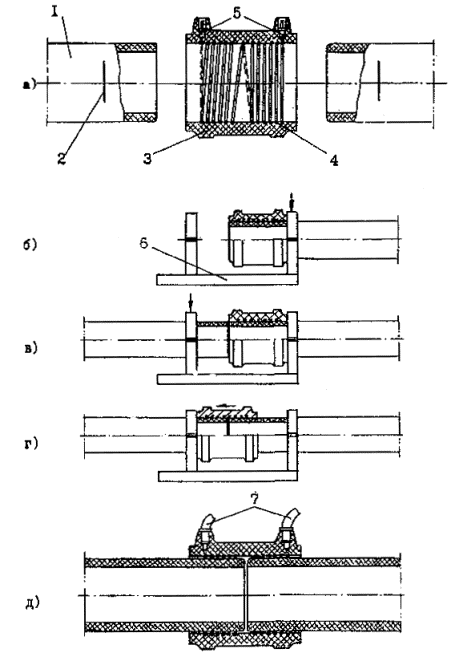 11.2. Сварка при помощи соединительных деталей с закладными нагревателями. 11.2.1. Этот метод сварки применяют для соединения труб из ПСП диаметром от 20 до 225 мм, а также для приварки к трубопроводу седловых отводов. 11.2.2. Сварку с помощью муфт с закладными нагревателями производят в случаях: соединения длинномерных труб (плетей) при прокладке новых газопроводов или восстановления ветхих стальных газопроводов методом протяжки в них полиэтиленовых труб; соединения труб с толщиной стенки менее 5 мм; ремонта газопроводов в стесненных условиях. 11.2.3. Сварку полиэтиленовых газопроводов с применением соединительных деталей с закладными нагревателями производят при температуре окружающего воздуха не ниже -50 и не выше +35°С. В случаях необходимости проведения сварки при других температурах работы выполняют в укрытиях (палатки, шатры и т.п.). Место сварки защищают от воздействия влаги, песка, пыли и т.п. 11.2.4. Технологический процесс соединения труб с помощью муфт с закладными нагревателями включает (рис. 16): подготовку концов труб (очистка от загрязнений, разметка, механическая обработка - циклевка сварных поверхностей и обезжиривание их); сборку стыка (установка и закрепление концов свариваемых труб в зажимах центрирующего приспособления с одновременной посадкой муфты, подключение к муфте сварочного аппарата); сварку (задание программы процесса сварки, пуск процесса сварки, нагрев, охлаждение соединения). Рис. 16. Соединение труб муфтой с закладным нагревателем: а - схема подготовки соединяемых элементов; б, в, г - схемы сборки стыка; д - собранный под сварку стык; 1 - труба, 2 - метка посадки муфты и механической обработки поверхности трубы, 3 - муфта, 4 - закладной нагреватель, 5 - клеммы токоподвода, 6 - приспособление для сборки, 7 - токоподводящие провода сварочного аппарата. 11.2.5. Очистку концов труб от загрязнений производят как указано в п. 11.1.6 настоящего СП. Длина очищаемых концов труб должна быть не менее 1,5 длины применяемых для сварки муфт. Перед механической обработкой на концы свариваемых труб на длину 1/2 длины муфты наносят метки глубины посадки муфты для обозначения зоны обработки. Механическая обработка концов труб заключается в снятии с поверхности размеченного конца трубы слоя толщиной 0,1-0,2 мм с помощью специальной зачистной оправки или ручной или механизированной цикли, а также снятии фасок для удаления заусенцев. Свариваемые поверхности труб после циклевки и муфты тщательно обезжиривают путем протирки салфеткой из хлопчатобумажной ткани или впитывающей бумаги, смоченной в спирте, уайт-спирите, ацетоне, или в других специальных рекомендованных составах. Муфты с закладными нагревателями, поставляемые изготовителем в индивидуальной герметичной упаковке, вскрываемой непосредственно перед сборкой, обезжириванию не подвергают. Механическую обработку и протирку труб и деталей производят непосредственно перед сборкой и сваркой. 11.2.6. Сборка стыка заключается в посадке муфты на концы свариваемых труб с установкой по ранее нанесенным меткам или по упору сборочного приспособления. Рекомендуется для сборки стыков использовать приспособление (рис. 16 б-г), которое позволяет установить, сцентрировать и закрепить концы свариваемых труб с одновременной посадкой муфты. Процесс сборки включает: надевание муфты на конец первой трубы до 