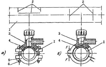 где: хd - максимальная длина трещины, появившейся в зоне сварки после испытания, мм; у - длина зоны сварки в пределах одной трубы, определяемая по расстоянию между крайними витками спирали закладного нагревательного элемента. Муфтовое соединение считается годным, если значения Сс не превышает величины, установленной техническими условиями на муфты с закладными нагревателями. 12.6. Испытание седловых отводов с закладными нагревателями на отдир производится отделением седлового отвода от полиэтиленовой трубы. Узел сварного соединения испытывается целиком. Подготовка к испытанию заключается в установке внутрь трубного образца круглой металлической оправки, после чего производится фрезерование боковых частей седлового отвода вдоль всей длины, если седловой отвод представляет собой хомут, обхватывающий трубу по окружности. В случае когда седловой отвод представляет собой полухомут, фрезерования боковых поверхностей не требуется. Фрезерование седлового отвода производится не ранее, чем через 6 часов после сварки. Время между фрезерованием и испытанием узла также не должно быть менее 6 часов. Испытание узла производится в соответствии с рис. 23. Скорость приложения нагрузки F должна составлять 20±2 мм/мин, если другие скорости не предусмотрены соответствующим стандартом на данный вид испытаний. Испытание производится до полного отделения седлового отвода от полиэтиленовой трубы. Во время испытания фиксируется характер разрушения. Результаты испытаний считаются положительными, если разрушение носит вязкий характер со следами "вырыва" материала из поверхности трубы и седлового отвода на 80% площади сварки. 12.7. При неудовлетворительных результатах механических испытаний хотя бы одного стыка сварщик выполняет, сварку удвоенного количества пробных стыков. Рис. 21. Общий вид образцов - сегментов. Рис. 22. Схема испытания образцов на сплющивание F-испытательная нагрузка а - узел перед испытанием б – испытание узла Рис. 23. Схема испытания седлового отвода на отдир. F-испытательная нагрузка 12.8. Если при повторном контроле получены неудовлетворительные результаты хотя бы по одному из дополнительно сваренных стыков при визуальном и измерительном контроле или при механических испытаниях, то сварщик признается не выдержавшим испытания. 12.9. По результатам визуального контроля и механических испытаний допускных стуков оформляется заключение о их качестве, на основании которого сварщик допускается (не допускается) к проведению сварочных работ. Форма заключения дана в "Правилах безопасности в газовом хозяйстве" и СНиП 3.05.02-88. Для сварных соединений с закладными нагревателями вместо таблицы результатов указывается процент декогезии (при испытании образцов муфтовых соединений на сплющивание) или процент вязкого разрушения (при испытании седловых отводов на отдир). 12.10. Каждому сварщику, допущенному к сварке, присваивается номер или шифр, который служит для регистрации работ в журнале производства работ и для маркировки (клеймения) стыков на газопроводе. 12.11. Сварщик, не выдержавший испытания, может быть допущен к повторным испытаниям только после прохождения дополнительной практики по сварке, но не ранее, чем через один месяц с момента проведения предыдущих испытаний или отстранения его от работы. 13. КОНТРОЛЬ КАЧЕСТВА СВАРНЫХ СОЕ
