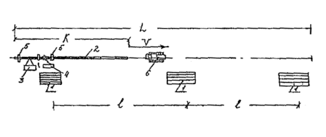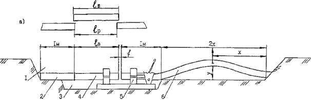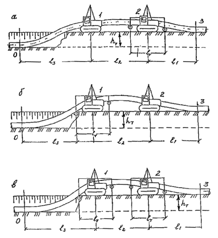 Следует отметить, что толщина стенки труб не оказывает влияния на выбор этих расстояний, т.е. они должны быть одинаковы, что для труб SDR 11 (тип Т), что для труб SDR 17,6 (тип С). Рис. 27. Схемы укладки трубопроводов с бермы траншеи с применением траверс. а - с траверсой у головного трубоукладчика; б - с траверсой у заднего трубоукладчика; в - с траверсами у обоих трубоукладчиков. 15.18. Цикличный метод укладки трубопроводов может осуществляться либо способом "перехвата" (когда трубоукладчики следуют друг за другом, каждый в своей колее), либо способом "переезда" (когда последний трубоукладчик поочередно объезжает передний трубоукладчик, используя при работе под нагрузкой одну большую колею). Количество трубоукладчиков в колонне при укладке цикличным методом должно равняться трем: два из них находятся постоянно под нагрузкой, образуя схему с параметрами, приведенными в табл. 15, а один используется для подмены других. 15.19. Укладку трубопроводов диаметром 110 мм и менее рекомендуется производить вручную с использованием ремней, пеньковых или капроновых канатов, брезентовых полотенец. Схема строповки трубопровода при этом должна быть аналогична той, что применяется при механизированной укладке. 15.20. При прокладке трубопроводов в узкой строительной полосе возможно применять на прямых участках способ монтажа трубопровода методом протягивания (рис. 28). Для этого в начальной точке участка трассы устраивается накопительная площадка и оборудуется сварочный пост, а в конечной точке этого участка устанавливается трактор-тягач или тяговая лебедка. Затем разрабатывается траншея. Для уменьшения коэффициента трения и, следовательно, тягового усилия (что позволяет увеличить длину протягиваемой плети), а также исключения возможных механических повреждений трубопровода на дне траншеи устраивается постель (ложе) из пенополимерных материалов (ППМ), по которой перемещается трубопровод. 15.21. Трубопровод через болота и обводненные участки может укладываться способом протаскивания или сплава. Рис. 28. Технологическая схема производства СМР методом протягивания. 1 – штабели труб; 2 – трубная плеть; 3 – кран-трубоукладчик; 4 – сварочная установка; 5 – монтажные опоры; 6 – трактор тягач. Усилие, прилагаемое к трубопроводу во время его протягивания и протаскивания через болота, не должно превышать величин, указанных в табл. 16. Предельно допустимые значения тяговых усилий