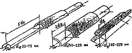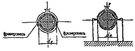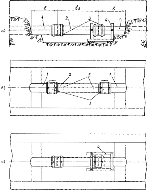 Рис. 20. Схемы освобождения трубопровода в траншее от грунтовой присыпки (а) и последовательности вварки трубной вставки с применением муфт с закладными нагревателями (б, в): 1 - концы трубопровода, 2 - трубная вставка, 3 - муфты, 4 - приспособление для сборки стыков, 5 - метки установки муфт, - длина освобождения концов трубопровода, в - длина вставки. 11.4.12. Вырезку поврежденного участка трубопровода и отрезку трубной вставки производят в соответствии с п. 11.4.8. 11.4.13. Подготовку концов трубопровода и муфт, их сборку и сварку производят, как указано в пп. 11.2.4-11.2.7 настоящего СП. 11.4.14. Установку трубной вставки и муфт в рассечку трубопровода и сварку производят в следующей последовательности (рис. 20 б, в): на подготовленные к оборке концы трубопровода надевают муфты; под один из концов трубопровода с муфтой подводят приспособление для сборки, в нем закрепляют конец трубопровода; в рассечку трубопровода вводят трубную вставку, один конец которой закрепляют в зажиме приспособления; на оба конца трубной вставки надвигают муфты с установкой их по меткам или по упору (в приспособлении); к муфте установленной в приспособлении, подключают сварочный аппарат и производят сварку; после охлаждения первого соединения приспособление устанавливают на второй стык и производят сварку. 11.4.15. Допускается при наличии двух комплектов оснастки (приспособлений и сварочных аппаратов) производить сборку и сварку одновременно двух соединений трубной вставки. 12. КВАЛИФИКАЦИОННЫЕ ИСПЫТАНИЯ СВАРЩИКОВ12.1. К производству сварочно-монтажных работ при строительстве полиэтиленовых газопроводов допускаются сварщики, аттестованные: при сварке встык нагретым инструментом - в соответствии с "Временным порядком аттестации сварщиков полиэтиленовых газопроводов", изложенным в Приложении 2 "Правил безопасности в газовом хозяйстве"; при сварке деталями с закладными нагревателями - в соответствии с дополнением к "Временному порядку аттестации сварщиков полиэтиленовых газопроводов", разработанному с учетом зарубежного опыта и согласованному с Госгортехнадзором России. 12.2. Независимо от наличия удостоверения на право производства работ сварщик должен сварить, в условиях близких к производственным допускные (пробные) стыки (соединения) в случаях: если сварщик впервые приступает к сварке газопровода или имел перерыв в работе по сварке более 1 месяца; если изменился материал или сортамент труб (деталей); если применен новый тип сварочного оборудования. 12.3. Допускные стыки должны изготавливаться из отрезков полиэтиленовых труб длиной не менее 300 мм, сваренных между собой при помощи муфт с закладными нагревателями или нагретым инструментом встык. Количество допускных стыков должно составлять не менее 3 штук. В случае использования длинномерных труб из ПСП, имеющих на всем протяжении только отдельные муфтовые сварные соединения (как правило, не более 10 шт.), количество допускных стыков может быть уменьшено до одного. В случае использования на строительном объекте седловых отводов с закладными нагревателями необходимость изготовления из них допускных соединений и последующих испытаний определяется местными органами Госгортехнадзора Российской Федерации. 12.4. Допускные стыки (соединения), сваренные нагретым инструментом встык, подвергают: а) визуальному контролю (внешне
