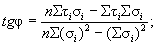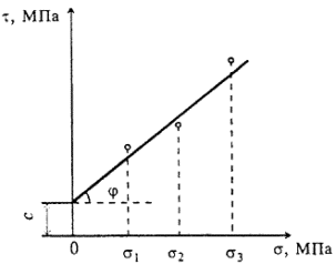где п - число испытаний. 5.3.7.4 Угол внутреннего трения φ и удельное сцепление с, МПа, вычисляют по формулам: